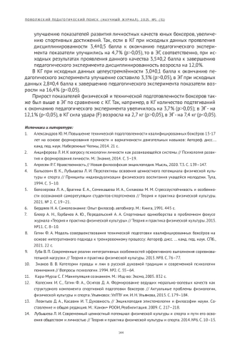 1. Александров Ю. М. Повышение технической подготовленности квалифицированных боксёров 15-17 лет на основе формирования прочности и вариативности двигательных навыков: Автореф. дисс.… канд. пед. наук. Набережные Челны, 2014. 21 с. EDN: LEEPSX