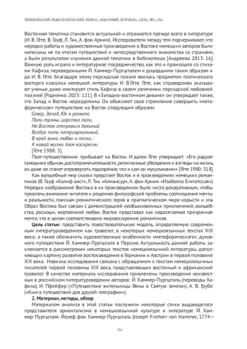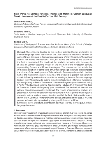 Статья посвящена исследованию восточных тем и мотивов в немецкоязычной литературе путешествий XIX века. Дан анализ ряда произведений литературы путешествий в немецкоязычной прозе XIX века. Подчеркнут интерес авторов не только к традиционному Западу, но и к странам и культуре Востока. Новизна данного исследования связана с анализом текстов немецкоязычных писателей первой половины ХIХ века, представляющих восточный и африканский травелог. Актуальность данной статьи заключается в рассмотрении некоторых текстов немецкоязычной литературы, дополняющих картину развития востоковедения в Германии и Австрии в первой половине ХIХ века. Цель статьи: представить повествовательную модель, определяемую современным литературоведением как травелог, в некоторых немецкоязычных текстах XIX века; обозначить художественные особенности духовного путешествия Й. Хаммер-Пургшталя в Персию. Рассмотрены тексты Й. Хаммер-Пургшталя (переводы Хафиза), И. Пфейфер («Путешествие жительницы Вены в Святую землю»), А. В. Грубе («Книга путешествий для друзей географии»). Методы исследования - культурно-исторический, сравнительно-исторический. Представлены результаты сопоставительного анализа: Й. Хаммер-Пургшталь в вольных переводах стихов Хафиза побуждает своих читателей совершить духовное путешествие в мир Востока. Его переводы были известны И. В. Гёте. И. Пфейфер показывает библейские древности Востока. А. В. Грубе преследует дидактическую цель, пробуждая этнографический интерес к Африке.