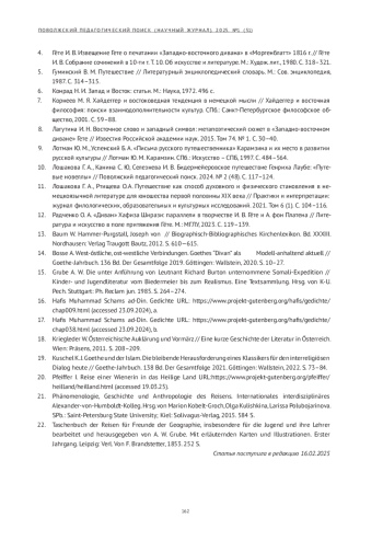 10. Лошакова Г. А., Канина С. Ю, Селезнева И. В. Бидермейеровское путешествие Генриха Лаубе: “Путевые новеллы” // Поволжский педагогический поиск. 2024. № 2 (48). С. 117-124. EDN: CUDXSU