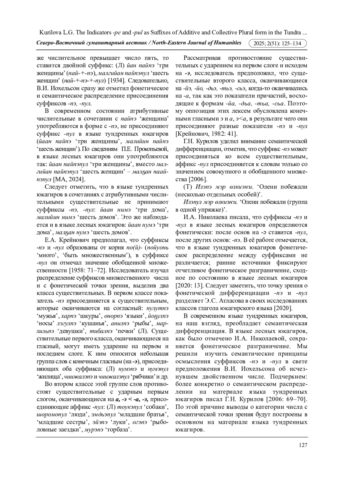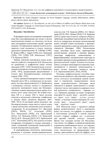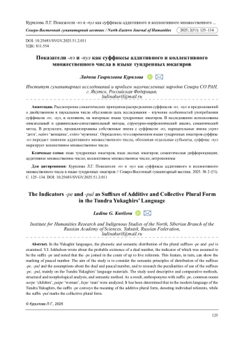 Рассмотрение семантических принципов распределения суффиксов -пэ, -пул и предположений о двойственном и паукальном числе обусловили цель исследования - изучение особенностей употребления суффиксов -пэ, -пул, в основном, на материале языка тундренных юкагиров. В исследовании использованы описательный и сравнительно-сопоставительный методы, структурно-морфологический анализ, семантический метод. В результате, проанализированы собственные имена с суффиксом -пэ, нарицательные имена уорпэ ‘дети’, пайпэ ‘женщина’, кэйпэ ‘мужчина’. Определено, что современном языке тундренных юкагиров суффикс -пэ передает значение аддитивного множественного числа, обозначая отдельные субъекты, суффикс -пул маркирует коллективное множественное число.