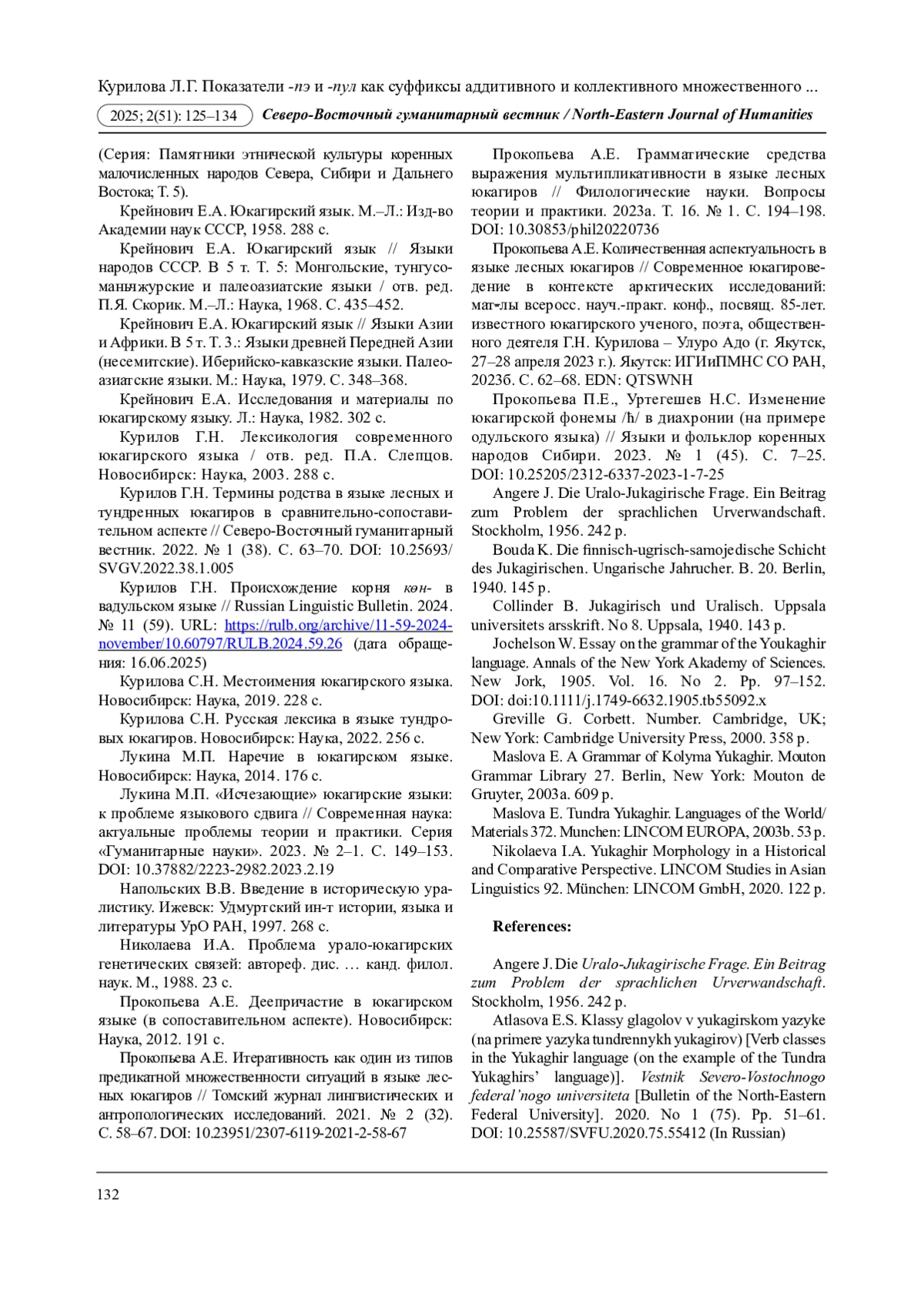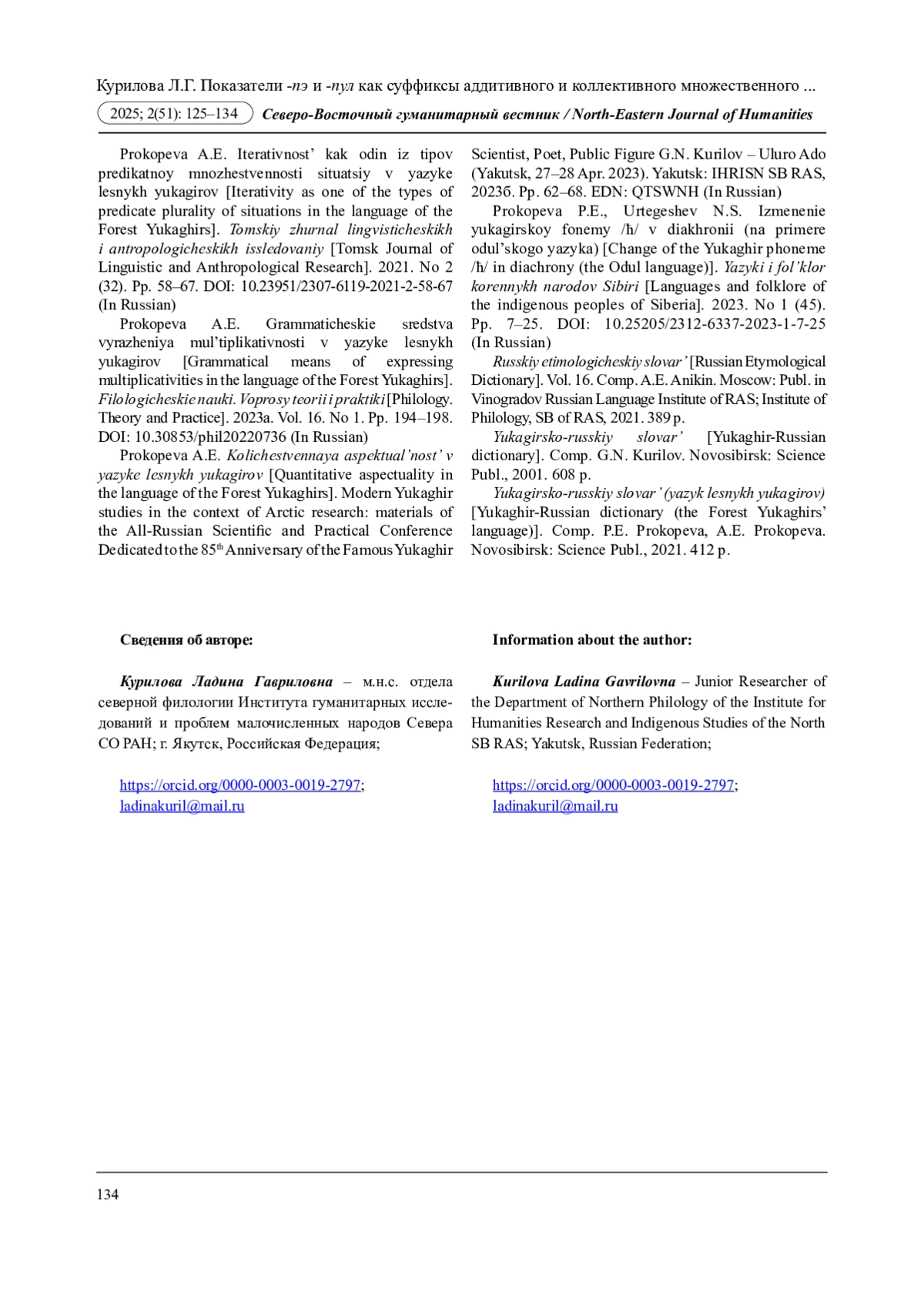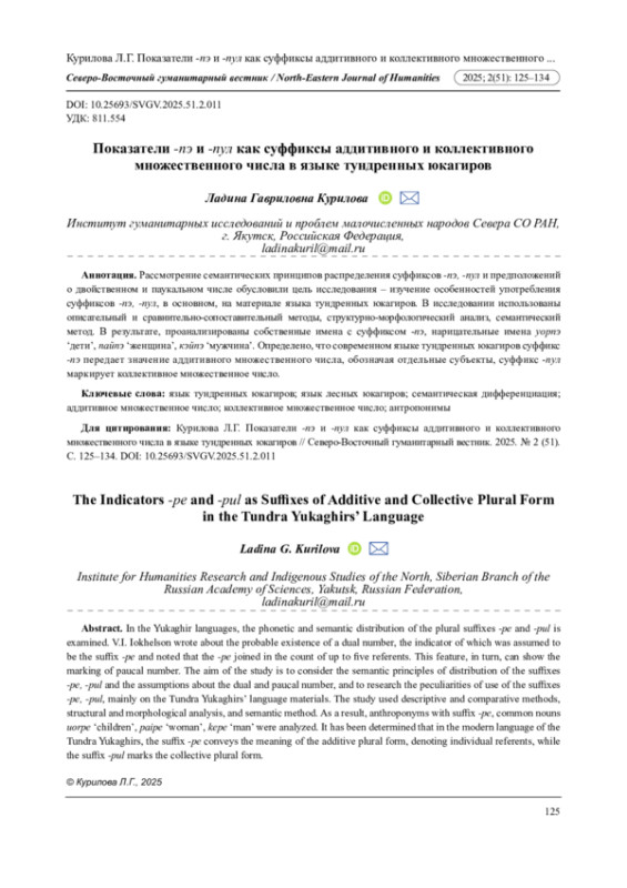 15. Курилов Г.Н. Термины родства в языке лесных и тундренных юкагиров в сравнительно-сопоставительном аспекте // Северо-Восточный гуманитарный вестник. 2022. № 1 (38). С. 63-70. DOI: 10.25693/SVGV.2022.38.1.005 EDN: BAPGCT