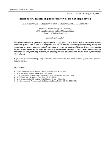O. M. Gasanov, H. A. Adgezalova, Dzh. I. Guseynov, and A. O. Dashdemir Influence of Gd atoms on photosensitivity of the SnS single crystal 42