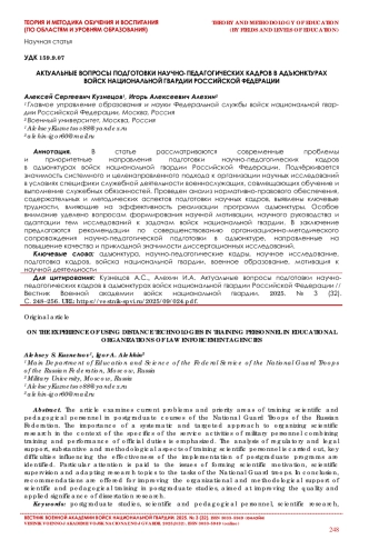 В статье рассматриваются современные проблемы и приоритетные направления подготовки научно-педагогических кадров в адъюнктурах войск национальной гвардии Российской Федерации. Подчёркивается значимость системного и целенаправленного подхода к организации научных исследований в условиях специфики служебной деятельности военнослужащих, совмещающих обучение и выполнение служебных обязанностей. Проведен анализ нормативно-правового обеспечения, содержательных и методических аспектов подготовки научных кадров, выявлены ключевые трудности, влияющие на эффективность реализации программ адъюнктуры. Особое внимание уделено вопросам формирования научной мотивации, научного руководства и адаптации тем исследований к задачам войск национальной гвардии. В заключение предлагаются рекомендации по совершенствованию организационно-методического сопровождения научно-педагогической подготовки в адъюнктуре, направленные на повышение качества и прикладной значимости диссертационных исследований.