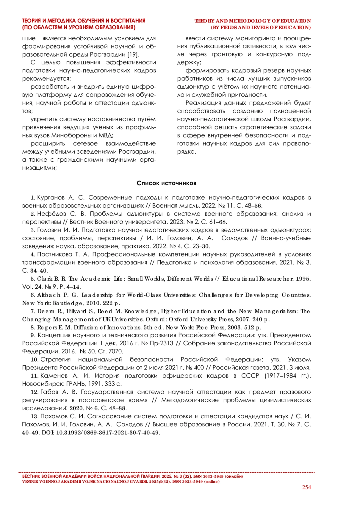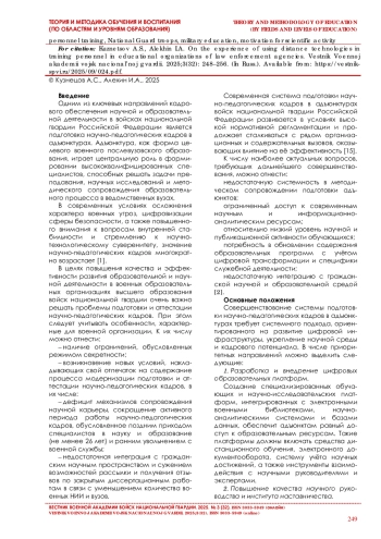 1. Курганов А. С. Современные подходы к подготовке научно-педагогических кадров в военных образовательных организациях // Военная мысль. 2022. № 11. С. 48-56.