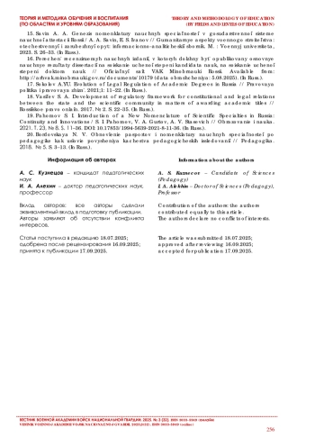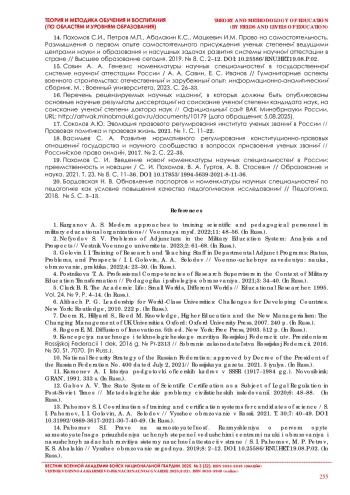 13. Пахомов С. И. Согласование систем подготовки и аттестации кандидатов наук / С. И. Пахомов, И. И. Головин, А. А. Солодов // Высшее образование в России. 2021. Т. 30. № 7. С. 40-49. DOI: 10.31992/0869-3617-2021-30-7-40-49
