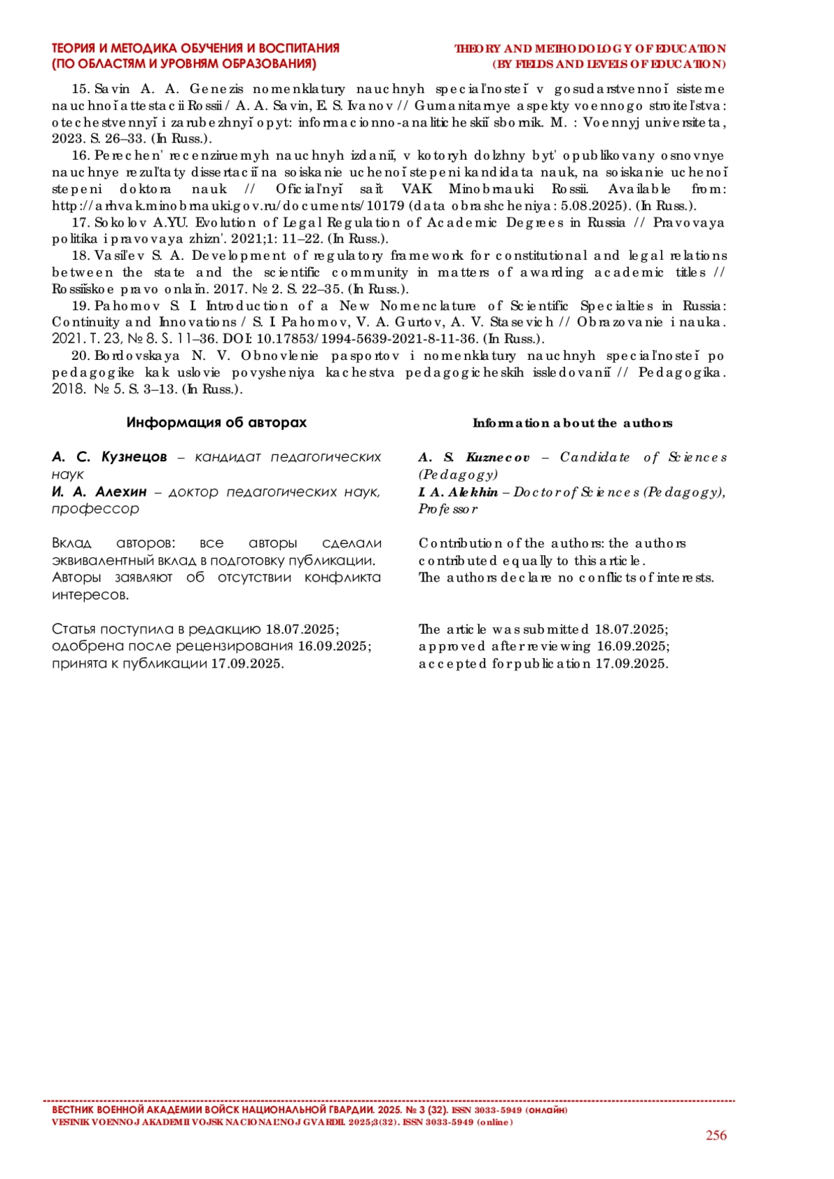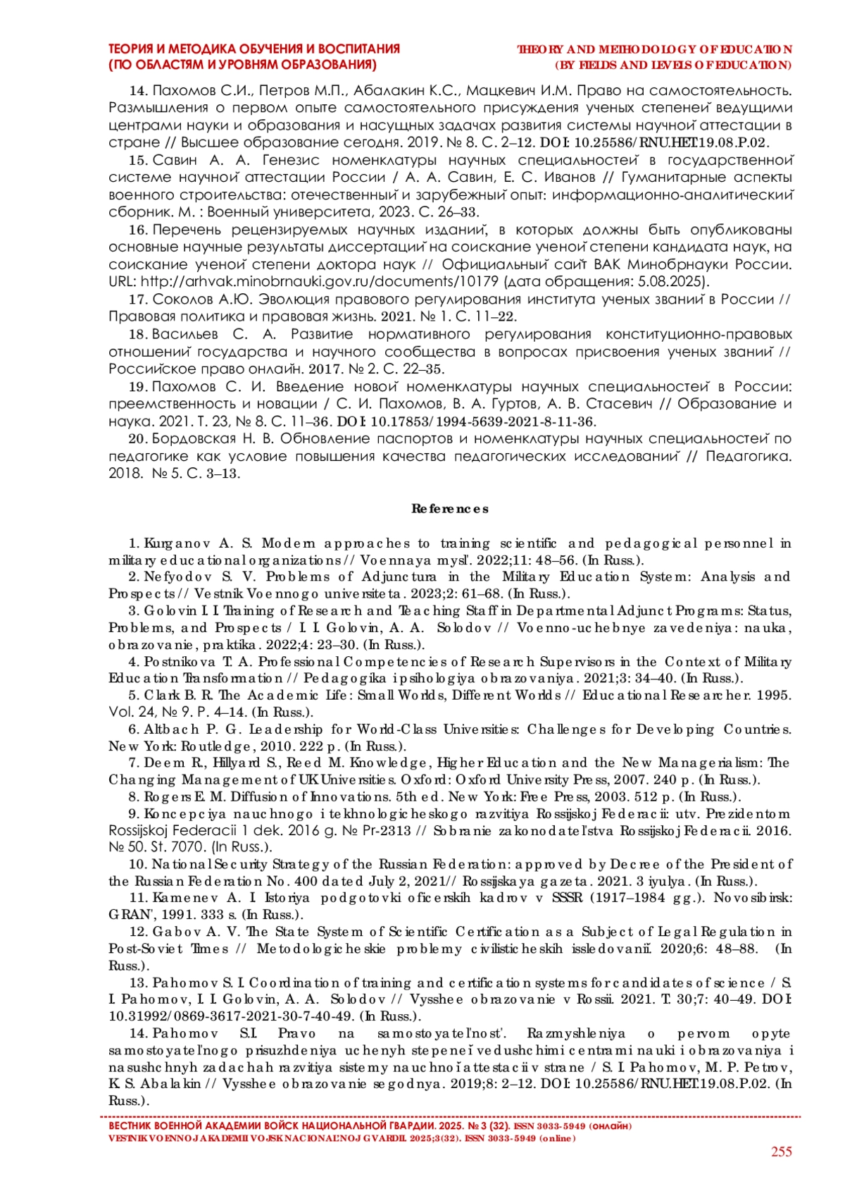 15. Савин А. А. Генезис номенклатуры научных специальностей в государственной системе научной аттестации России // Гуманитарные аспекты военного строительства: отечественный и зарубежный опыт. М., 2023. С. 26-33.