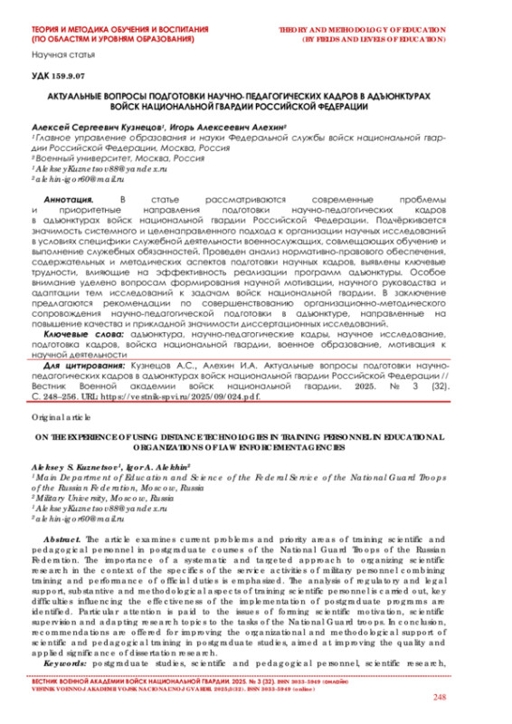 Одним из ключевых направлений кадрового обеспечения научной и образовательной деятельности в войсках национальной гвардии Российской Федерации является подготовка научно-педагогических кадров в адъюнктурах. Адъюнктура, как форма целевого военного послевузовского образования, играет центральную роль в формировании высококвалифицированных специалистов, способных решать задачи преподавания, научных исследований и методического сопровождения образовательного процесса в ведомственных вузах.