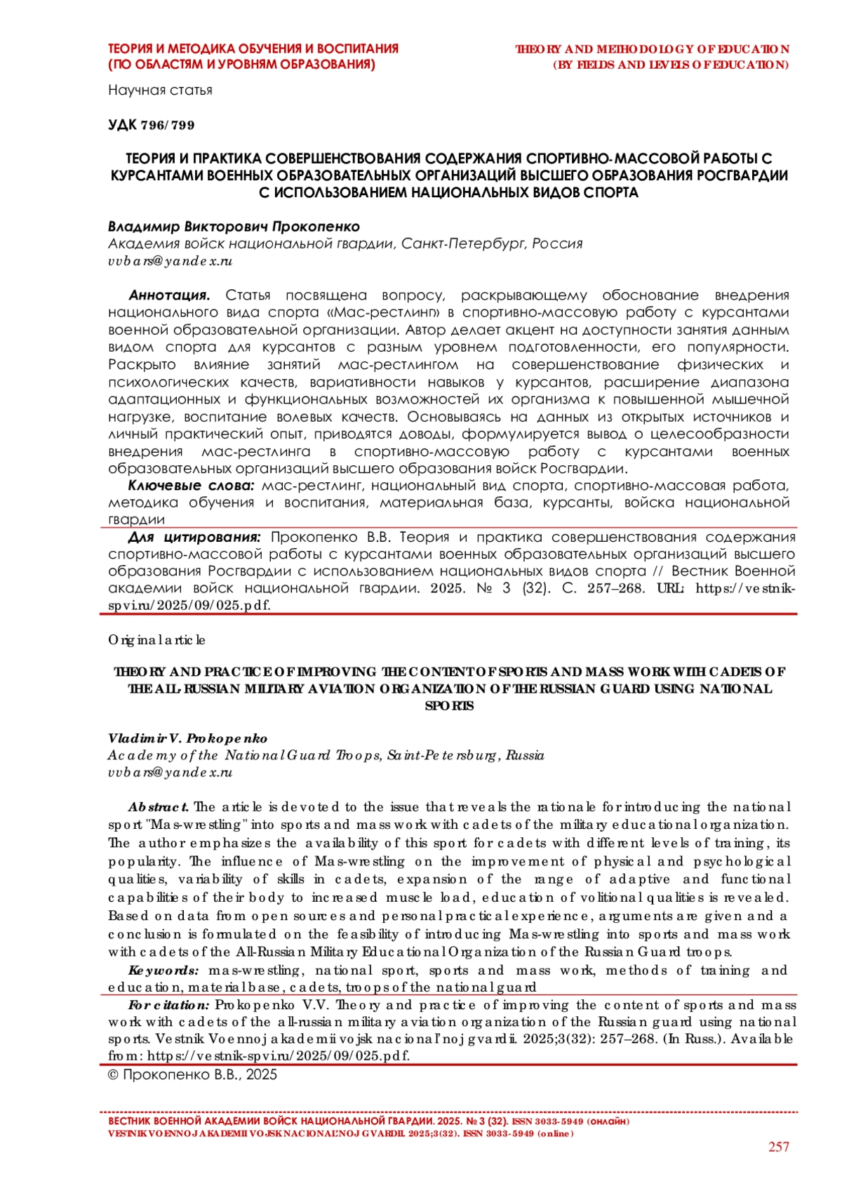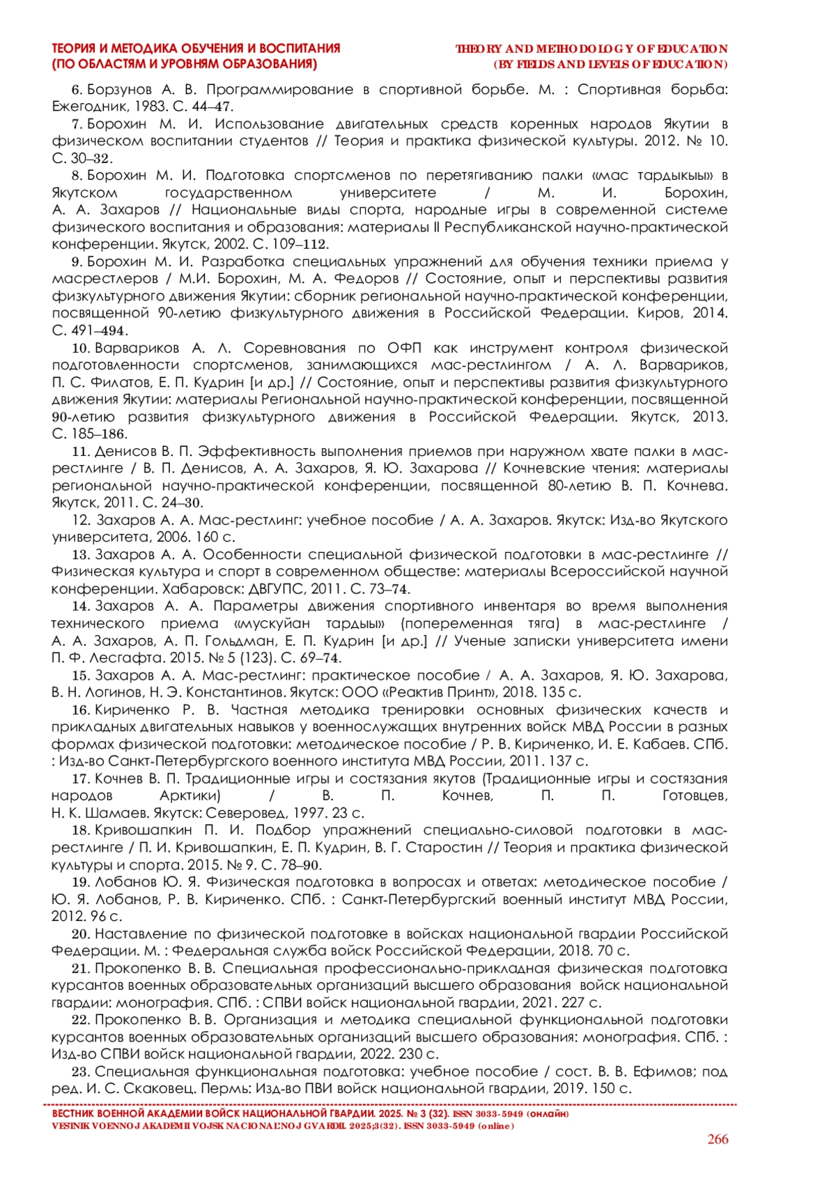 22. Прокопенко В. В. Организация и методика специальной функциональной подготовки курсантов военных образовательных организаций высшего образования: монография. СПб.: Изд-во СПВИ войск национальной гвардии, 2022. 230 с.
