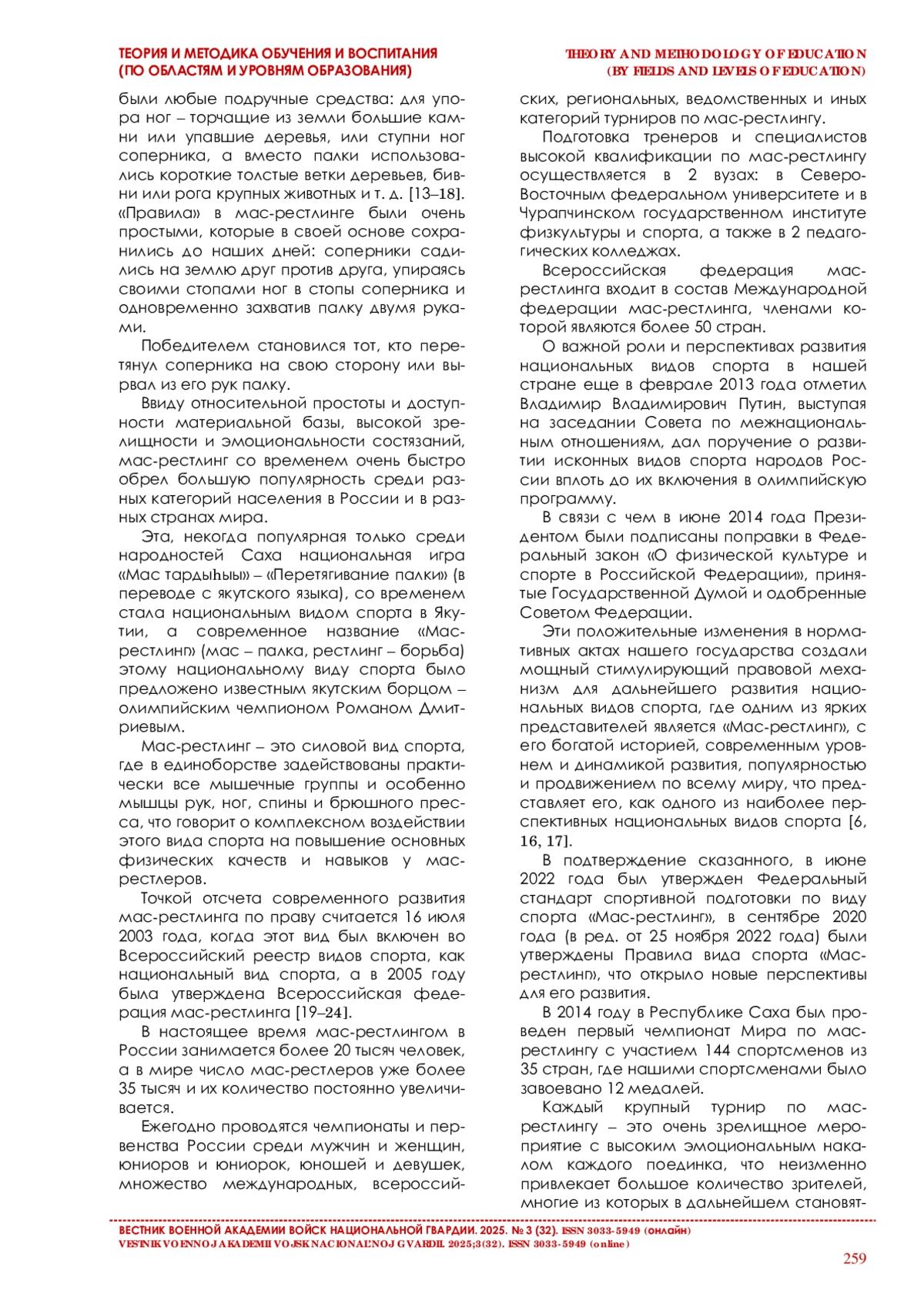 13. Захаров А. А. Особенности специальной физической подготовки в мас-рестлинге // Физическая культура и спорт в современном обществе: материалы Всероссийской научной конференции. Хабаровск: ДВГУПС, 2011. С. 73-74.