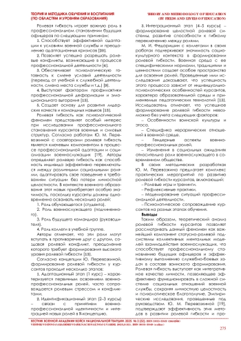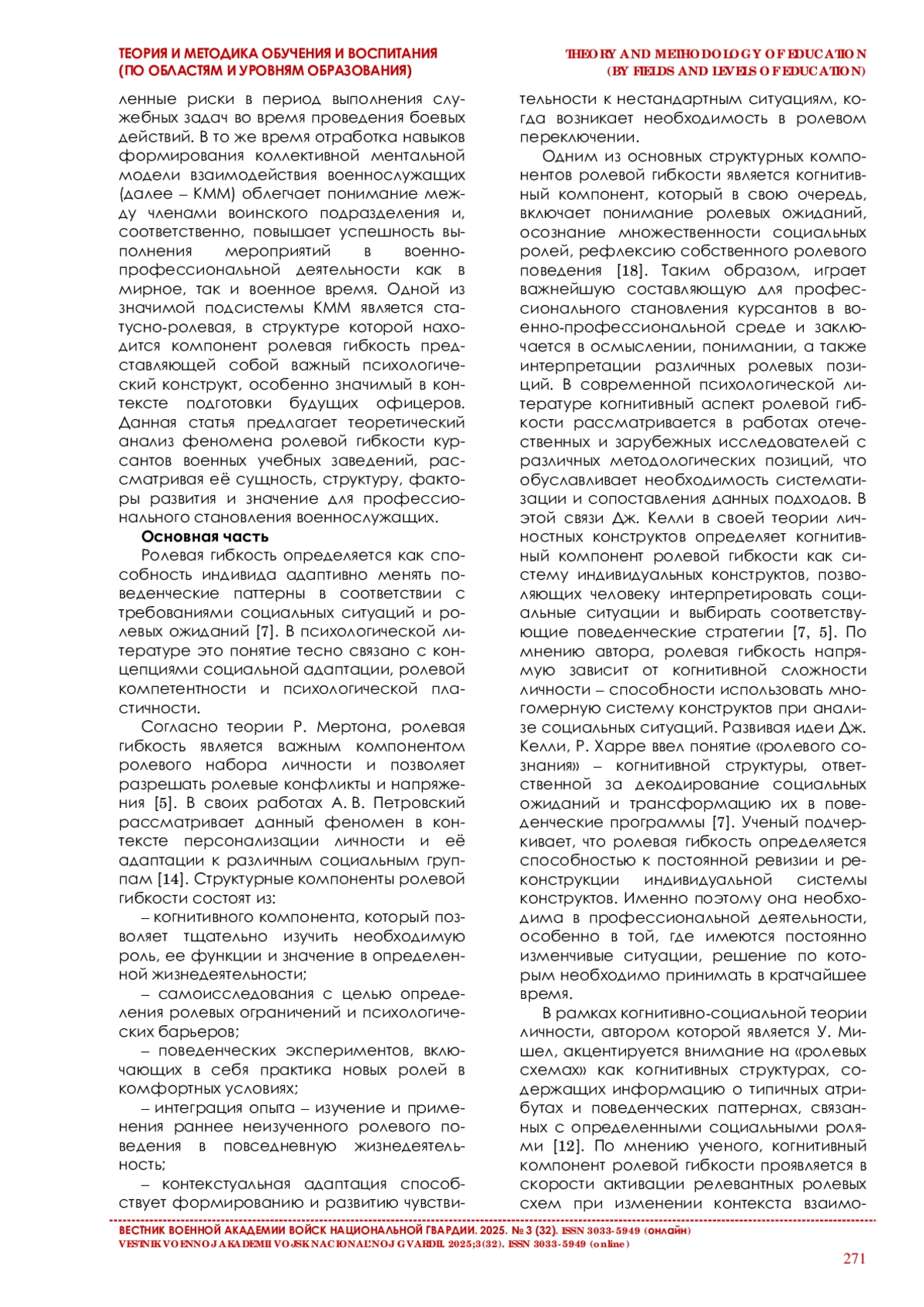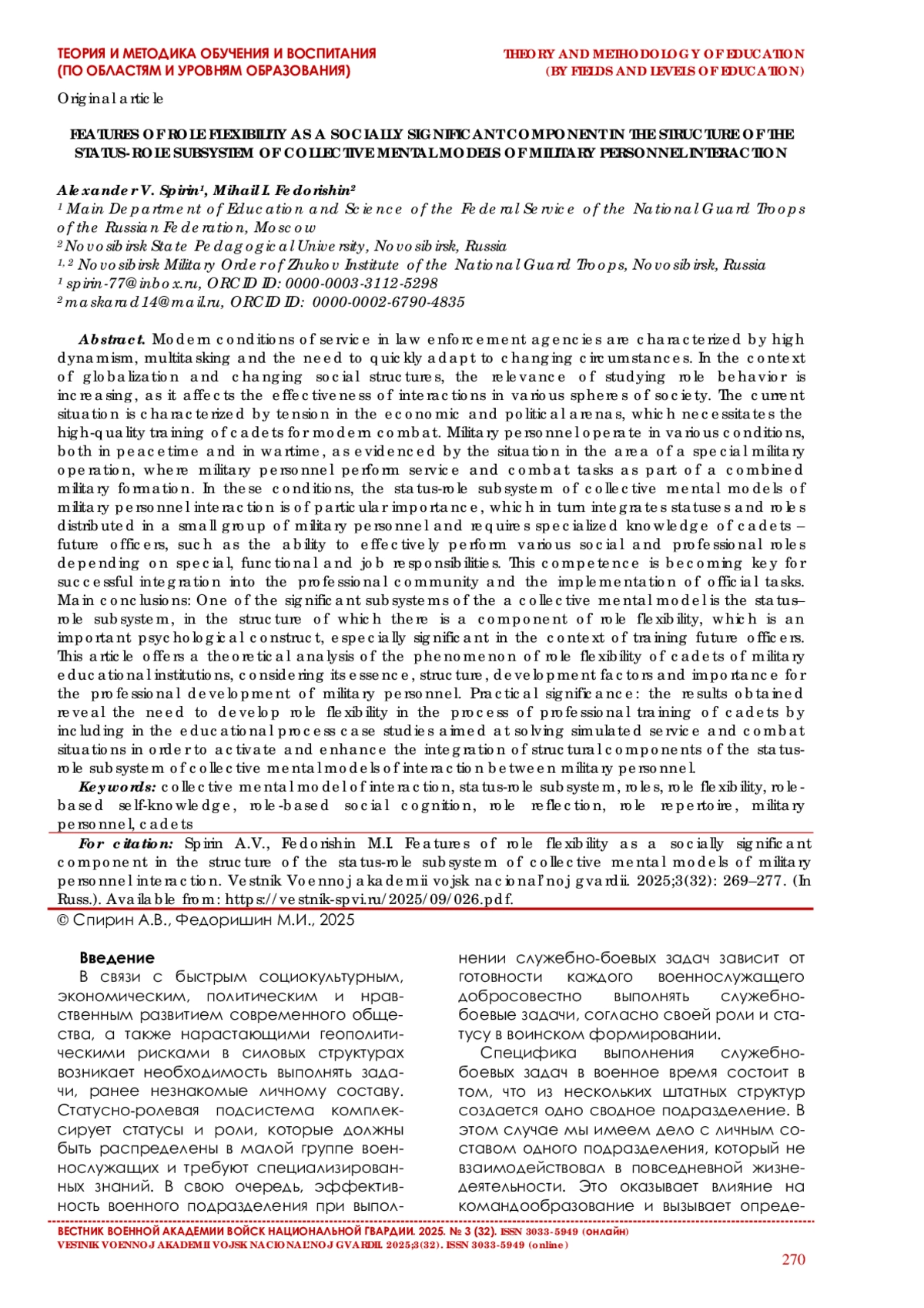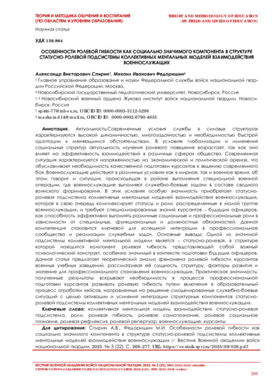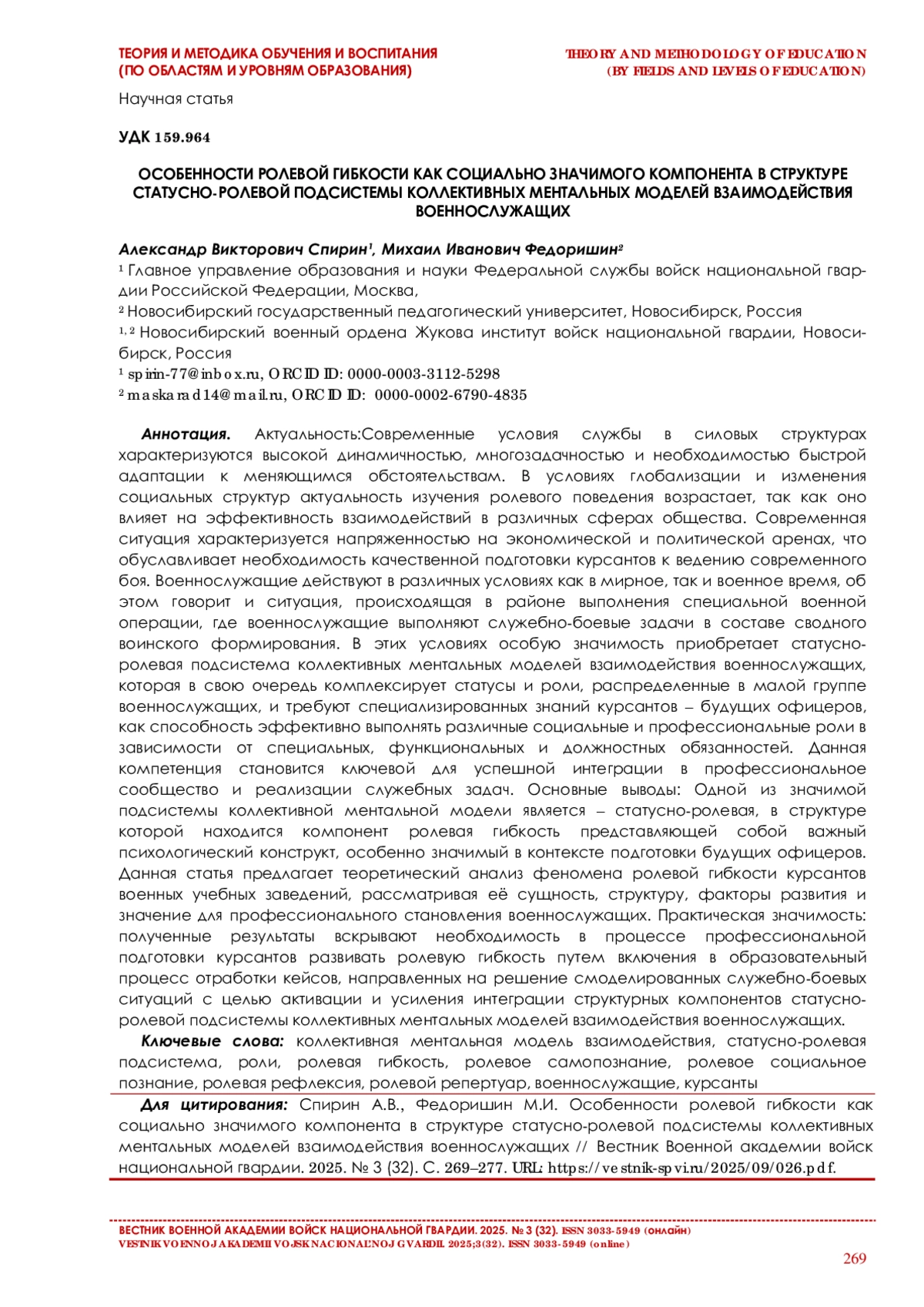 Современные условия службы в силовых структурах характеризуются высокой динамичностью, многозадачностью и необходимостью быстрой адаптации к меняющимся обстоятельствам. В условиях глобализации и изменения социальных структур актуальность изучения ролевого поведения возрастает, так как оно влияет на эффективность взаимодействий в различных сферах общества. Современная ситуация характеризуется напряженностью на экономической и политической аренах, что обуславливает необходимость качественной подготовки курсантов к ведению современного боя. Военнослужащие действуют в различных условиях как в мирное, так и военное время, об этом говорит и ситуация, происходящая в районе выполнения специальной военной операции, где военнослужащие выполняют служебно-боевые задачи в составе сводного воинского формирования. В этих условиях особую значимость приобретает статусно-ролевая подсистема коллективных ментальных моделей взаимодействия военнослужащих, которая в свою очередь комплексирует статусы и роли, распределенные в малой группе военнослужащих, и требуют специализированных знаний курсантов – будущих офицеров, как способность эффективно выполнять различные социальные и профессиональные роли в зависимости от специальных, функциональных и должностных обязанностей. Данная компетенция становится ключевой для успешной интеграции в профессиональное сообщество и реализации служебных задач. Основные выводы: Одной из значимой подсистемы коллективной ментальной модели является – статусно-ролевая, в структуре которой находится компонент ролевая гибкость представляющей собой важный психологический конструкт, особенно значимый в контексте подготовки будущих офицеров. Данная статья предлагает теоретический анализ феномена ролевой гибкости курсантов военных учебных заведений, рассматривая её сущность, структуру, факторы развития и значение для профессионального становления военнослужащих. Практическая значимость: полученные результаты вскрывают необходимость в процессе профессиональной подготовки курсантов развивать ролевую гибкость путем включения в образовательный процесс отработки кейсов, направленных на решение смоделированных служебно-боевых ситуаций с целью активации и усиления интеграции структурных компонентов статусно-ролевой подсистемы коллективных ментальных моделей взаимодействия военнослужащих.