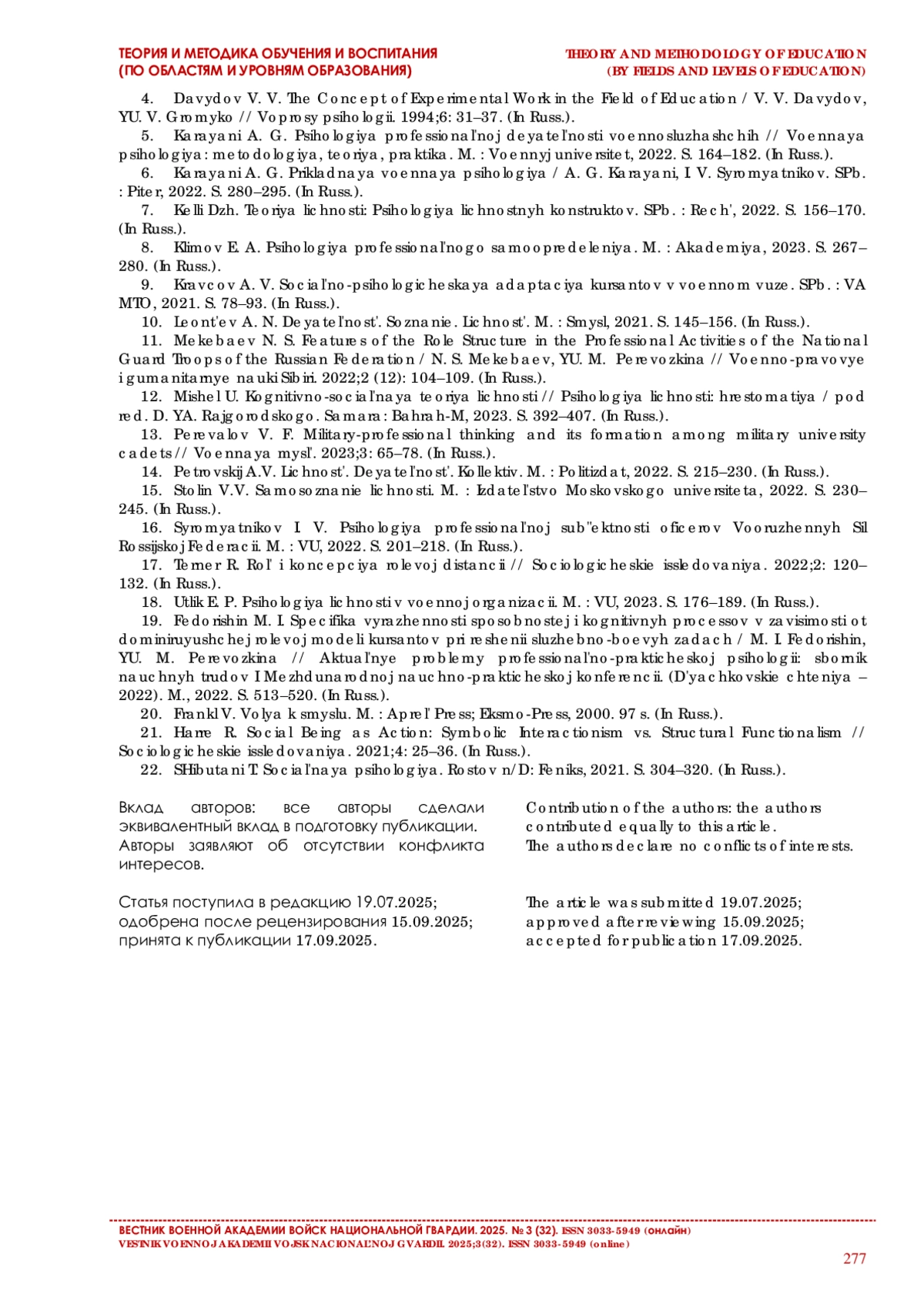 13. Перевалов В. Ф. Военно-профессиональное мышление и его формирование у курсантов военных вузов // Военная мысль. 2023. № 3. С. 65-78.