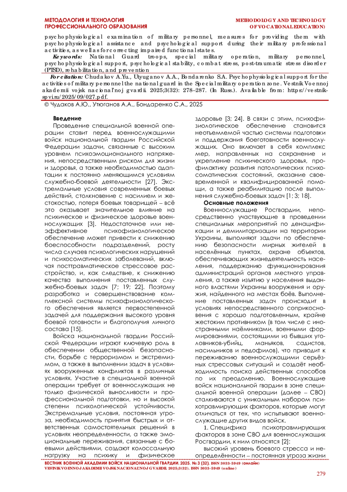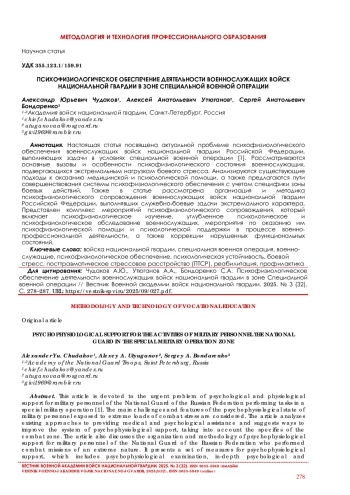 Настоящая статья посвящена актуальной проблеме психофизиологического обеспечения военнослужащих войск национальной гвардии Российской Федерации, выполняющих задачи в условиях специальной военной операции [1]. Рассматриваются основные вызовы и особенности психофизиологического состояния военнослужащих, подвергающихся экстремальным нагрузкам боевого стресса. Анализируются существующие подходы к оказанию медицинской и психологической помощи, а также предлагаются пути совершенствования системы психофизиологического обеспечения с учетом специфики зоны боевых действий. Также в статье рассмотрена организация и методика психофизиологического сопровождения военнослужащих войск национальной гвардии Российской Федерации, выполнявших служебно-боевые задачи экстремального характера. Представлен комплекс мероприятий психофизиологического сопровождения, который включает психофизиологическое изучение, углубленное психологическое и психофизиологическое обследование военнослужащих, мероприятия по оказанию им психофизиологической помощи и психологической поддержки в процессе военнопрофессиональной деятельности, а также коррекции нарушенных функциональных состояний.