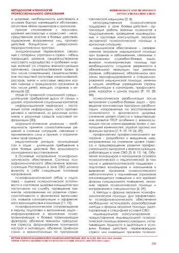 Проведение специальной военной операции ставит перед военнослужащими войск национальной гвардии Российской Федерации задачи, связанные с высоким уровнем психоэмоционального напряжения, непосредственным риском для жизни и здоровья, а также необходимостью адаптации к постоянно меняющимся условиям служебно-боевой деятельности [27]. Экстремальные условия современных боевых действий, столкновение с насилием и жестокостью, потеря боевых товарищей – всё это оказывает значительное влияние на психическое и физическое здоровье военнослужащих [3]. Недостаточное или неэффективное психофизиологическое обеспечение может привести к снижению боеспособности подразделений, росту числа случаев психологических нарушений и психосоматических заболеваний, включая посттравматическое стрессовое расстройство, и, как следствие, к снижению качества выполнения поставленных служебно-боевых задач [7; 19; 22]. Поэтому разработка и совершенствование комплексной системы психофизиологического обеспечения является первостепенной задачей для поддержания высокого уровня боевой готовности и благополучия личного состава [15].