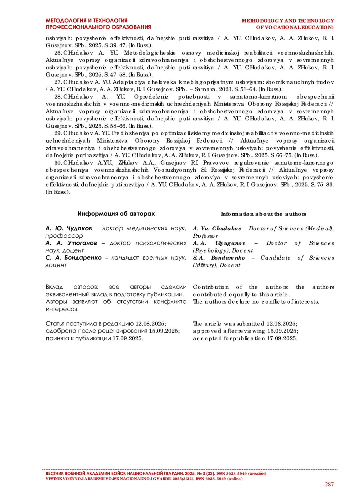 26. Чудаков А. Ю. Методологические основы медицинской реабилитации военнослужащих. Актуальные вопросы организации здравоохранения и общественного здоровья в современных условиях. СПб., 2025. С. 47-58.