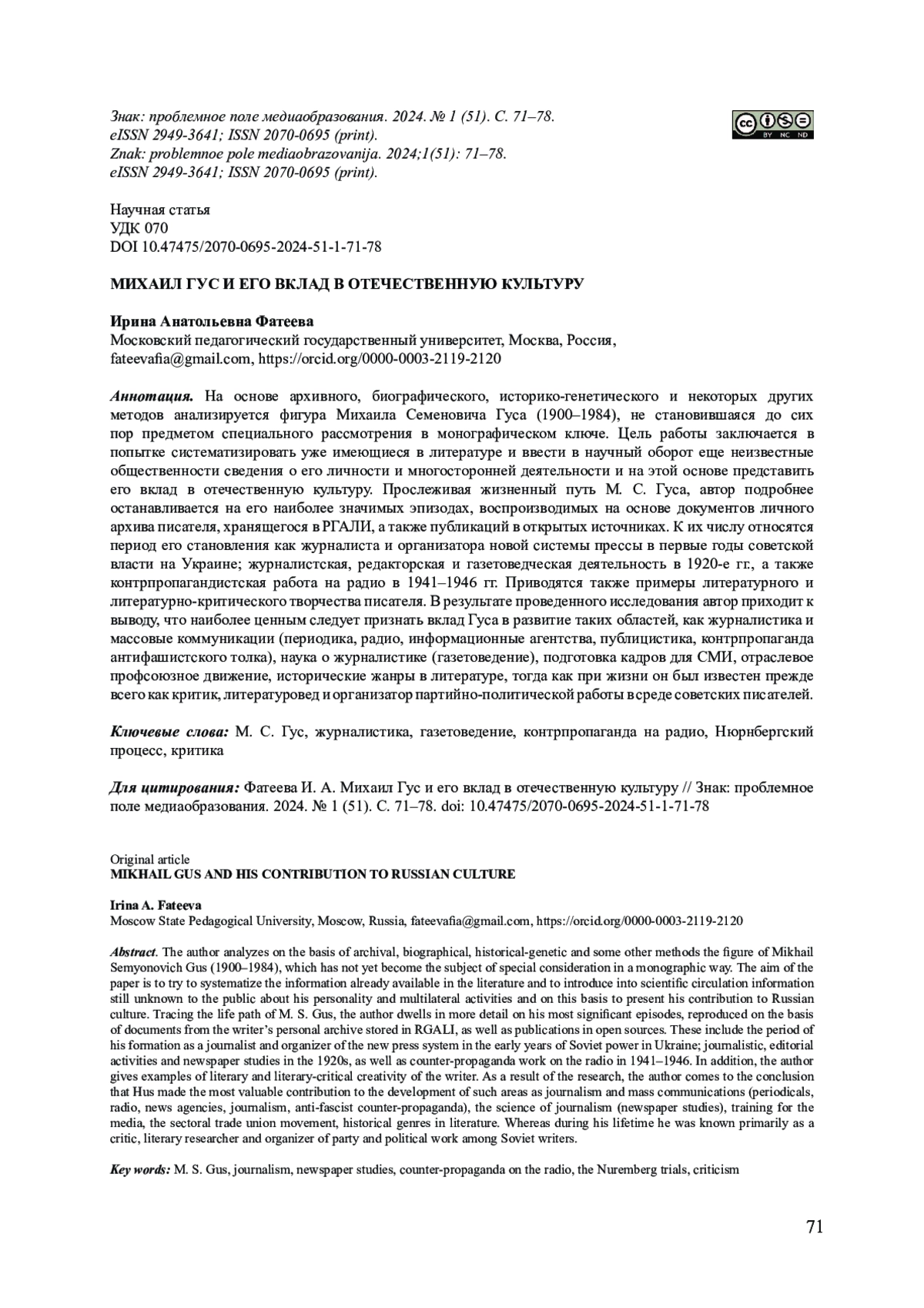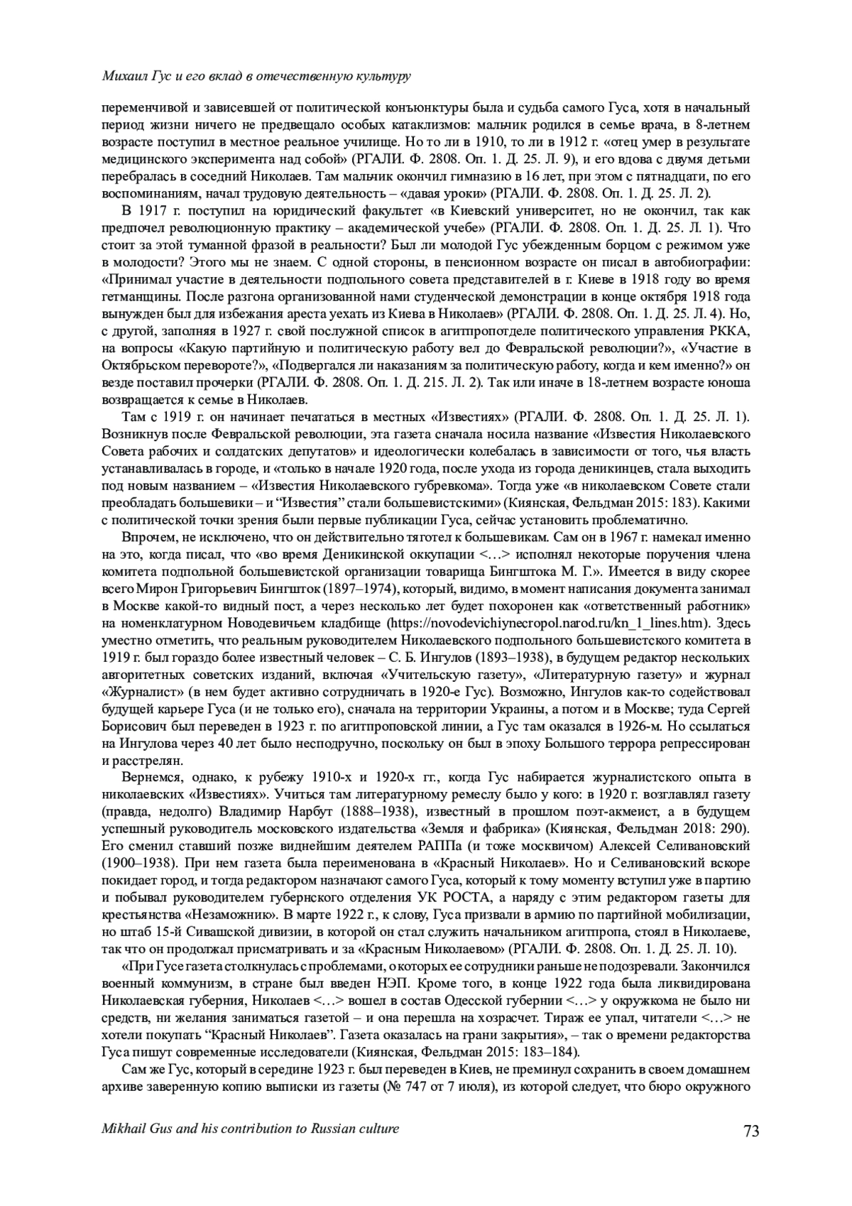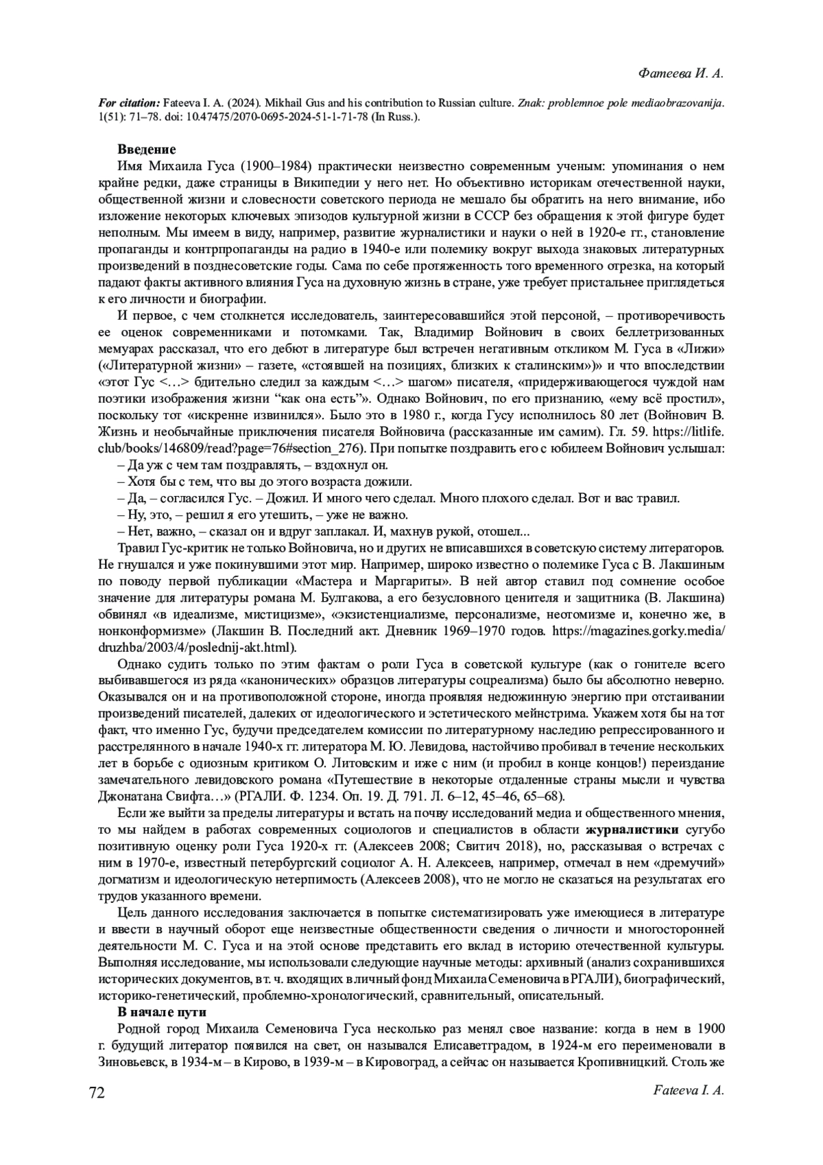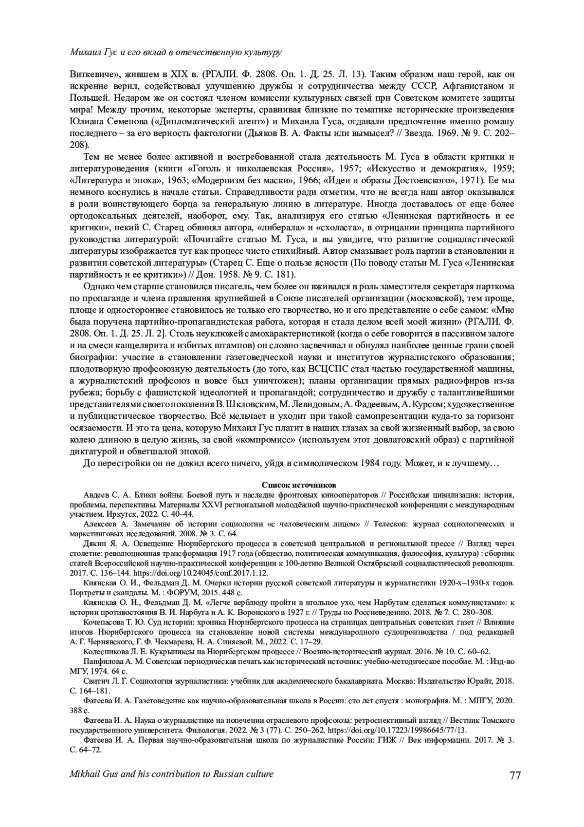 На основе архивного, биографического, историко-генетического и некоторых других методов анализируется фигура Михаила Семеновича Гуса (1900-1984), не становившаяся до сих пор предметом специального рассмотрения в монографическом ключе. Цель работы заключается в попытке систематизировать уже имеющиеся в литературе и ввести в научный оборот еще неизвестные общественности сведения о его личности и многосторонней деятельности и на этой основе представить его вклад в отечественную культуру. Прослеживая жизненный путь М. С. Гуса, автор подробнее останавливается на его наиболее значимых эпизодах, воспроизводимых на основе документов личного архива писателя, хранящегося в РГАЛИ, а также публикаций в открытых источниках. К их числу относятся период его становления как журналиста и организатора новой системы прессы в первые годы советской власти на Украине; журналистская, редакторская и газетоведческая деятельность в 1920-е гг., а также контрпропагандистская работа на радио в 1941-1946 гг. Приводятся также примеры литературного и литературно-критического творчества писателя. В результате проведенного исследования автор приходит к выводу, что наиболее ценным следует признать вклад Гуса в развитие таких областей, как журналистика и массовые коммуникации (периодика, радио, информационные агентства, публицистика, контрпропаганда антифашистского толка), наука о журналистике (газетоведение), подготовка кадров для СМИ, отраслевое профсоюзное движение, исторические жанры в литературе, тогда как при жизни он был известен прежде всего как критик, литературовед и организатор партийно-политической работы в среде советских писателей.