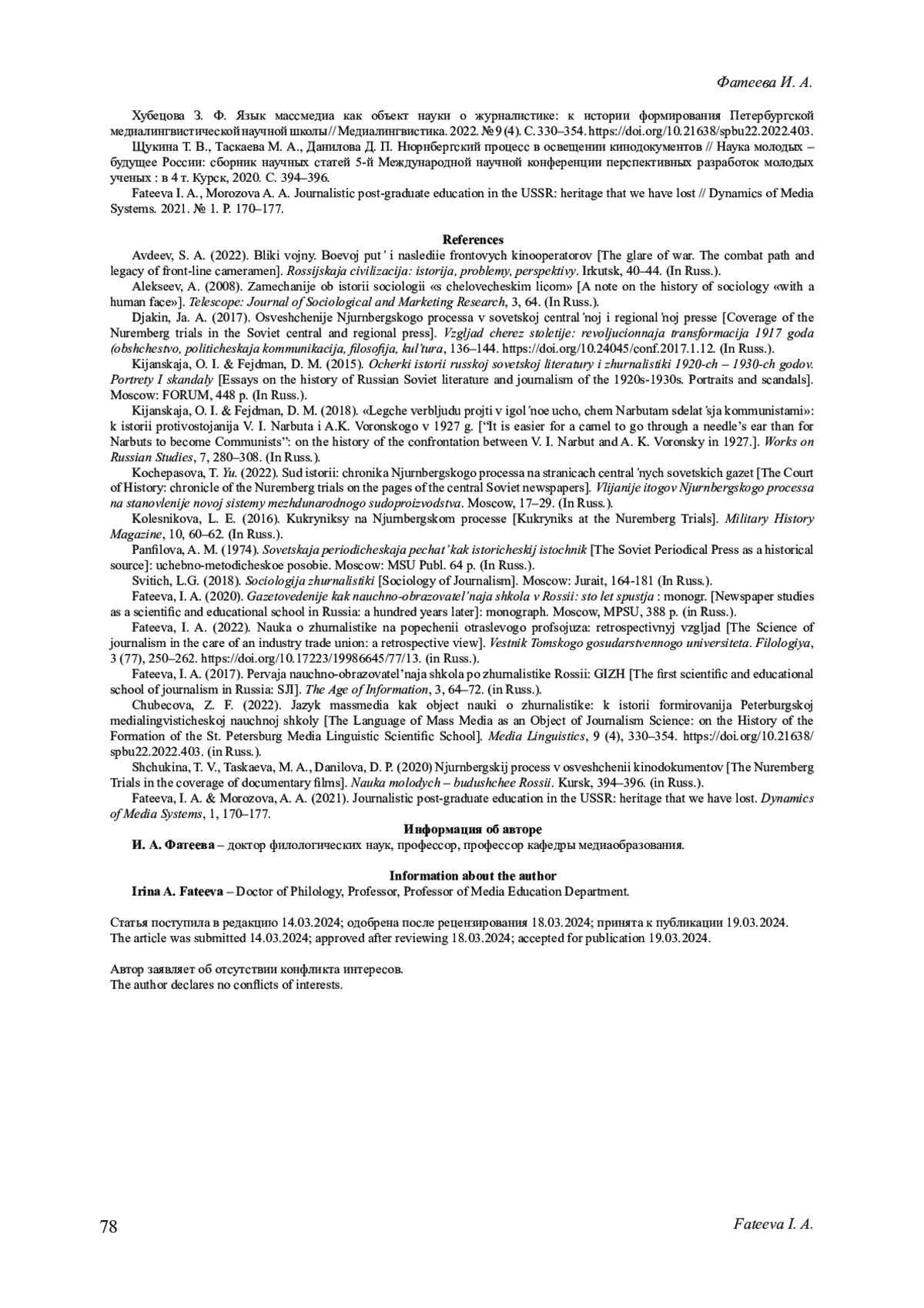 15. Fateeva I. A., Morozova A. A. Journalistic post-graduate education in the USSR: heritage that we have lost // Dynamics of Media Systems. 2021. № 1. P. 170-177. EDN: QRULUA