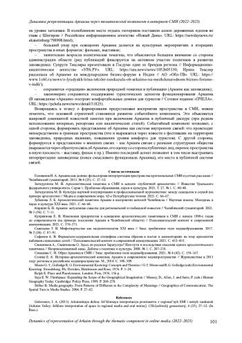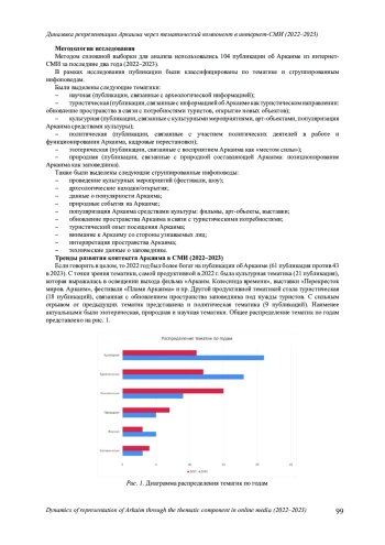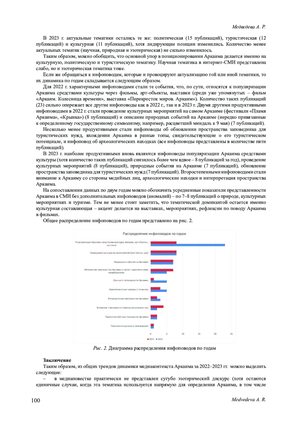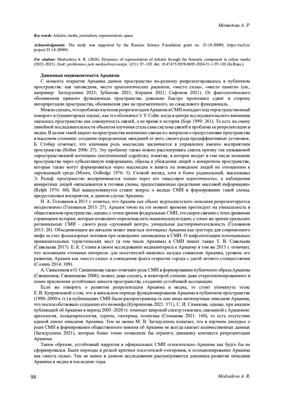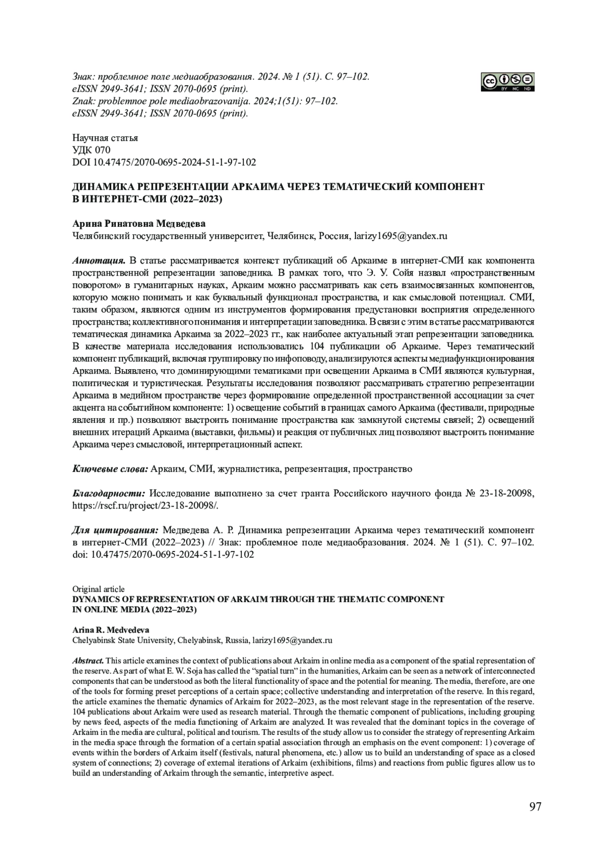 В статье рассматривается контекст публикаций об Аркаиме в интернет-СМИ как компонента пространственной репрезентации заповедника. В рамках того, что Э. У. Сойя назвал «пространственным поворотом» в гуманитарных науках, Аркаим можно рассматривать как сеть взаимосвязанных компонентов, которую можно понимать и как буквальный функционал пространства, и как смысловой потенциал. СМИ, таким образом, являются одним из инструментов формирования предустановки восприятия определенного пространства; коллективного понимания и интерпретации заповедника. В связи с этим в статье рассматриваются тематическая динамика Аркаима за 2022-2023 гг., как наиболее актуальный этап репрезентации заповедника. В качестве материала исследования использовались 104 публикации об Аркаиме. Через тематический компонент публикаций, включая группировку по инфоповоду, анализируются аспекты медиафункционирования Аркаима. Выявлено, что доминирующими тематиками при освещении Аркаима в СМИ являются культурная, политическая и туристическая. Результаты исследования позволяют рассматривать стратегию репрезентации Аркаима в медийном пространстве через формирование определенной пространственной ассоциации за счет акцента на событийном компоненте: 1) освещение событий в границах самого Аркаима (фестивали, природные явления и пр.) позволяют выстроить понимание пространства как замкнутой системы связей; 2) освещений внешних итераций Аркаима (выставки, фильмы) и реакция от публичных лиц позволяют выстроить понимание Аркаима через смысловой, интерпретационный аспект.