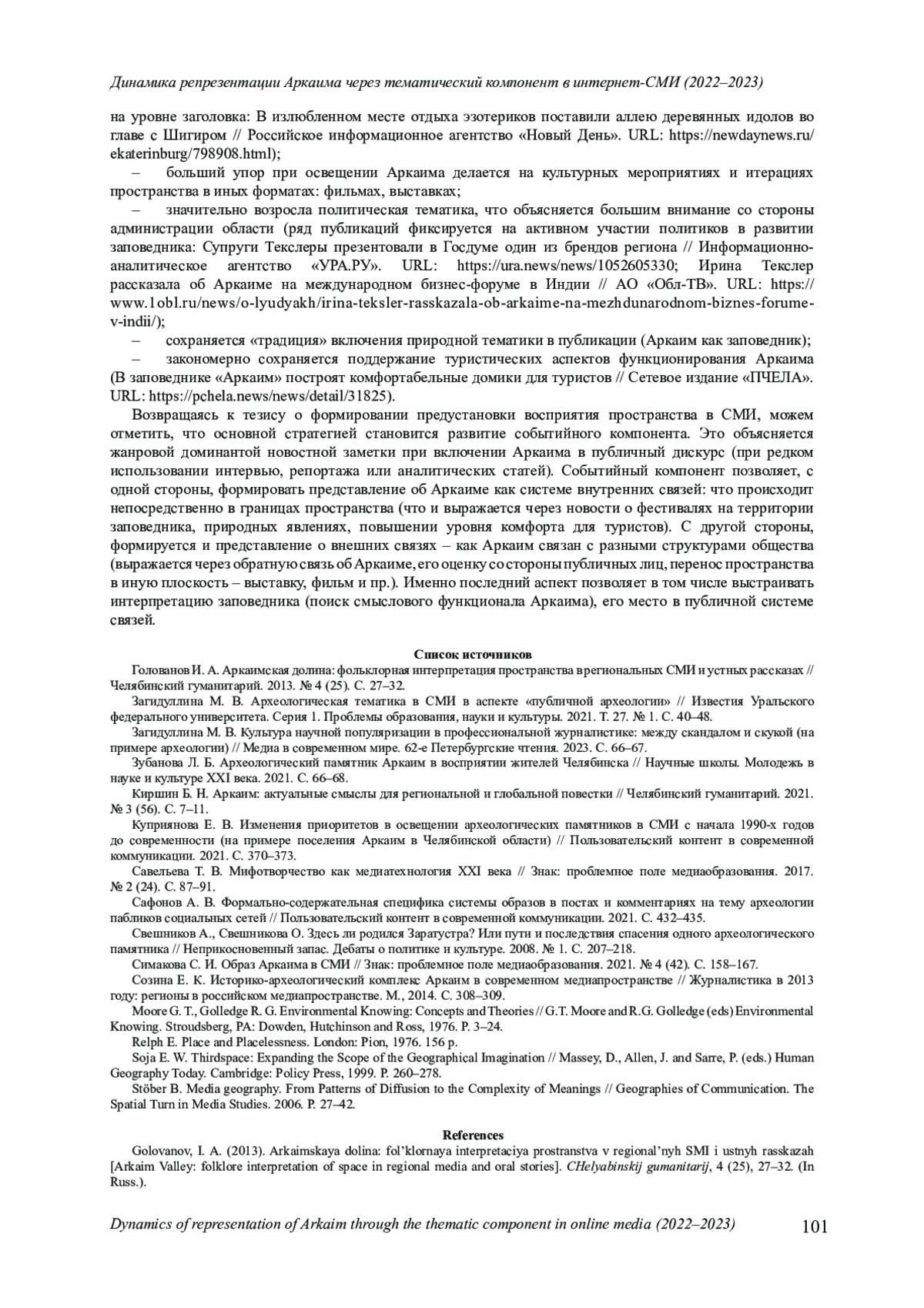 1. Голованов И. А. Аркаимская долина: фольклорная интерпретация пространства в региональных СМИ и устных рассказах // Челябинский гуманитарий. 2013. № 4 (25). С. 27-32. EDN: SQVTRD