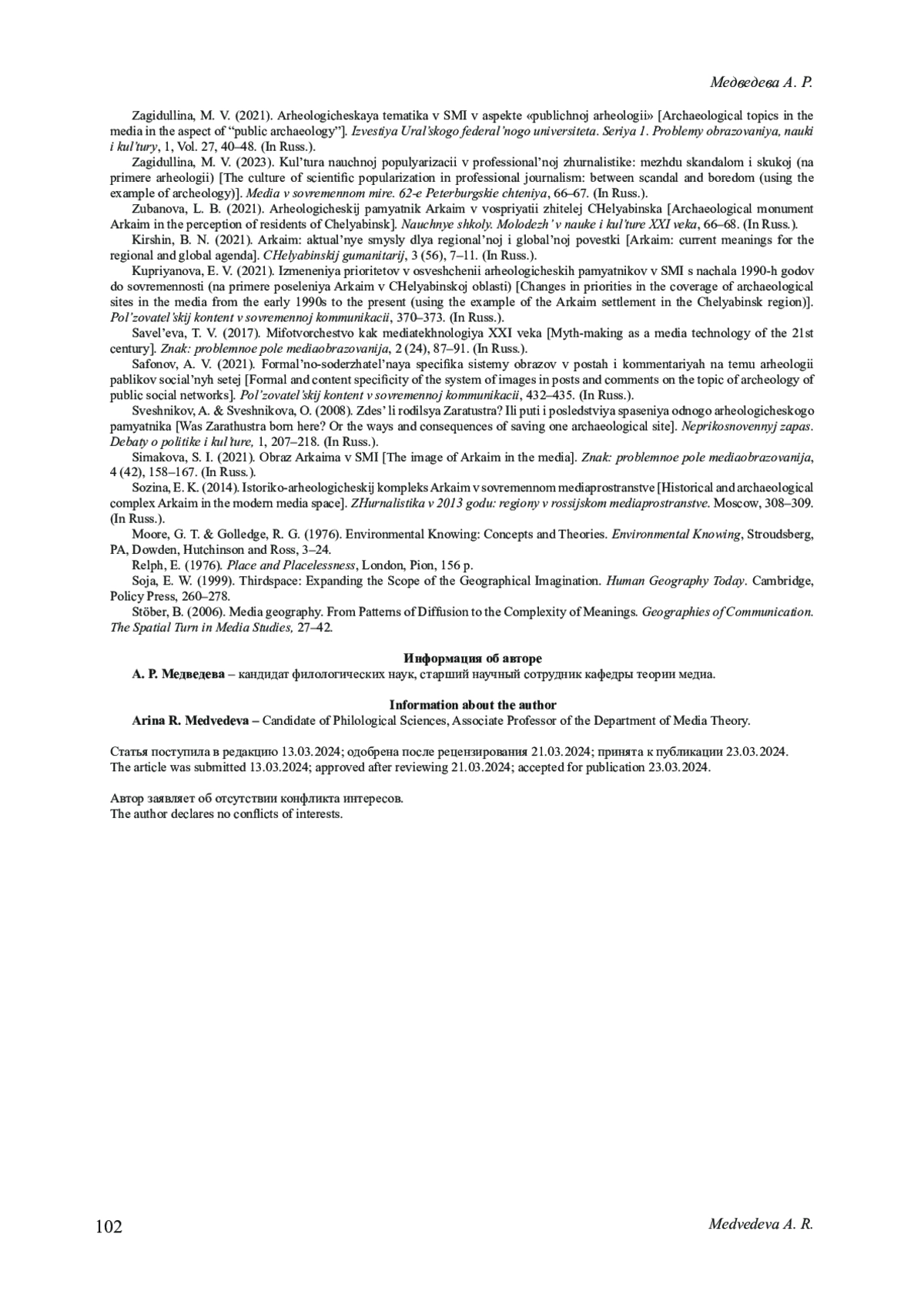 2. Загидуллина М. В. Археологическая тематика в СМИ в аспекте “публичной археологии” // Известия Уральского федерального университета. Серия 1. Проблемы образования, науки и культуры. 2021. Т. 27. № 1. С. 40-48. EDN: ZOBFLO