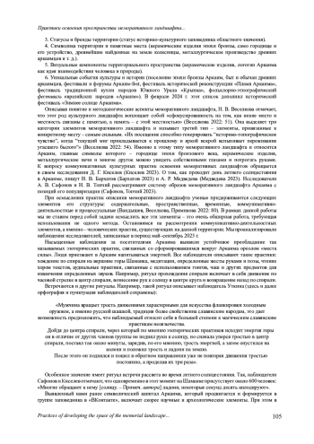 3. Веселкова Н. В. Меморативный ландшафт: опыт методологической рефлексии // Меморативные ландшафты малых городов России и Польши: Сборник научных трудов / Уральский федеральный университет имени первого Президента России Б. Н. Ельцина; Естественно-гуманитарный университет (г. Седльце, Польша). Екатеринбург: Издательство Уральского университета, 2022. С. 50-61. EDN: RUJIAD