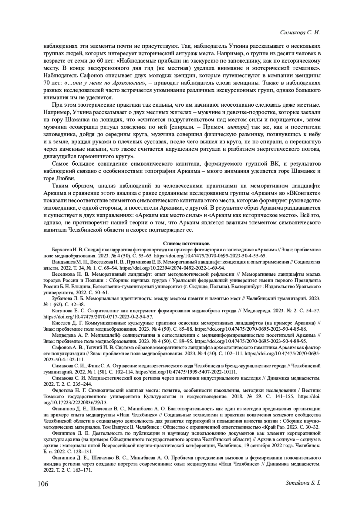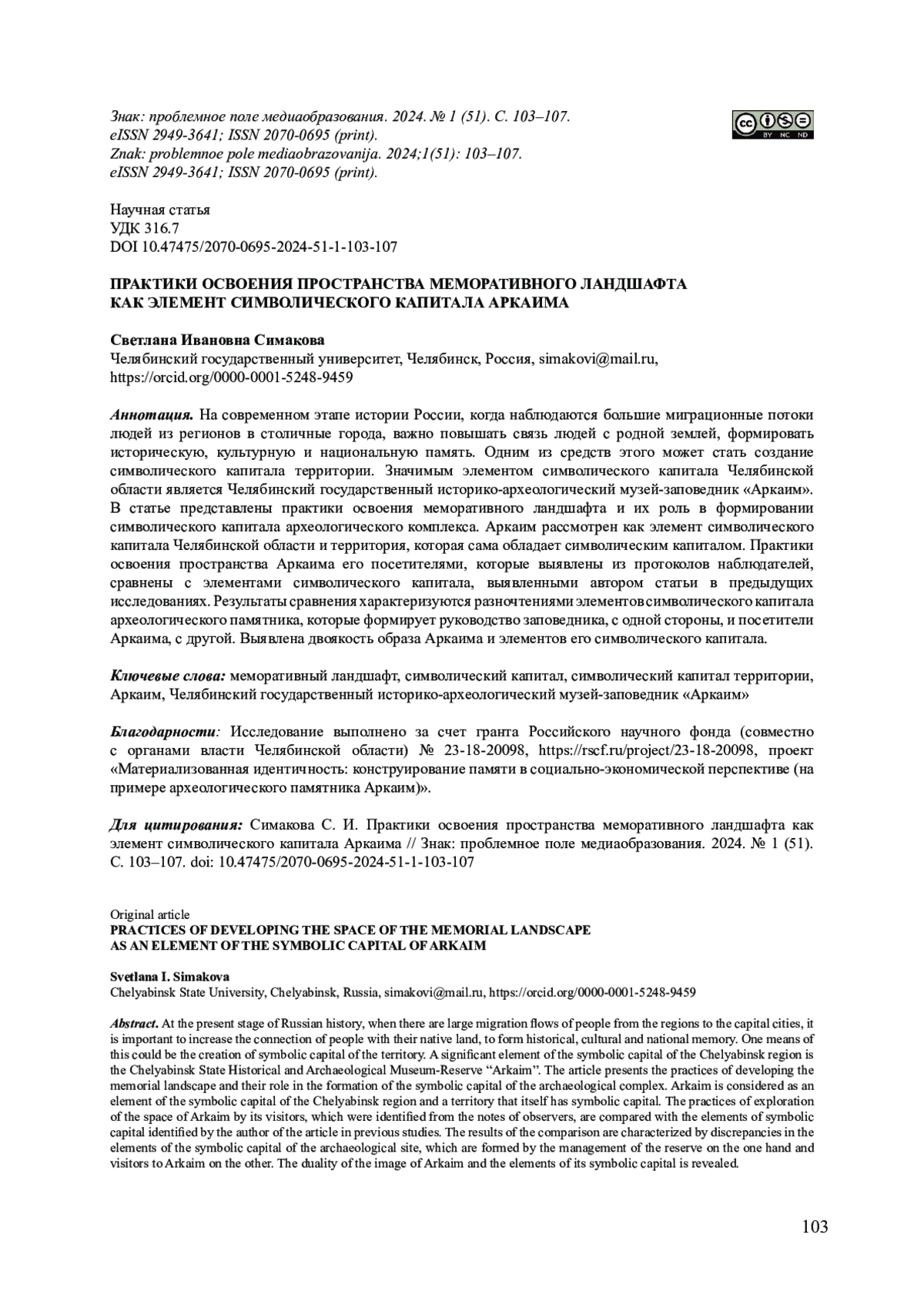 8. Сафонов А. В., Топчий И. В. Система образов меморативного ландшафта археологического памятника Аркаим как фактор его популяризации // Знак: проблемное поле медиаобразования. 2023. № 4 (50). С. 102-111. DOI: 10.47475/2070-0695-2023-50-4-102-111 EDN: MUYSOG