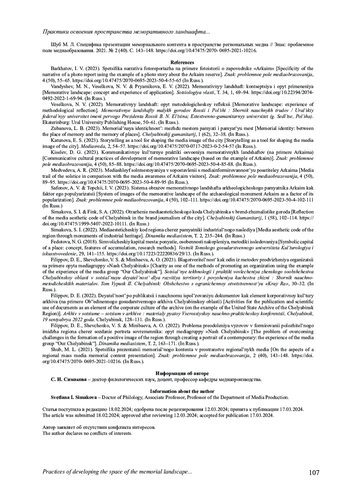15. Шуб М. Л. Специфика презентации мемориального контента в пространстве региональных медиа // Знак: проблемное поле медиаобразования. 2021. № 2 (40). С. 143-148. DOI: 10.47475/2070-0695-2021-10216 EDN: DELJIE