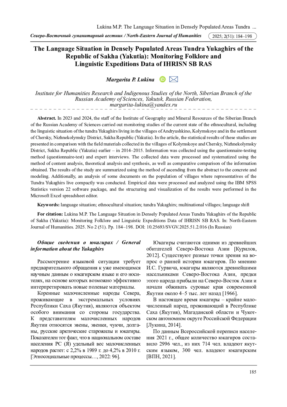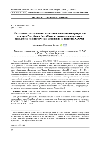 В 2023, 2024 гг. сотрудники ИГИиПМНС СО РАН выполнили мониторинговые исследования современного состояния этнокультурной, в том числе языковой ситуации тундренных юкагиров, проживающих в с. Андрюшкино, с. Колымское и пос. Черский Нижнеколымского района Республики Саха (Якутия). В представленной работе статистические результаты этих исследований приводятся в сравнении с полевыми материалами, собранными в с. Колымское и пос. Черский Нижнеколымского района РС (Я) ранее - в 2014-2015 гг. Сбор информации осуществлялся методами структурированного (формализованного) интервью (анкеты-опросника) населения и экспертного выборочного интервью. Обработка и систематизация собранных данных выполнялась с помощью метода контент-анализа, теоретического анализа и синтеза, а также сравнительного сопоставления полученной информации. Итоги исследования подведены с применением метода восхождения от абстрактного к конкретному и моделирования. Дополнительно проведен анализ некоторых документов о численности населения сел, где компактно проживают представители тундренных юкагиров. Эмпирические данные обработаны и проанализированы с использованием программного пакета IBM SPSS Statistics версии 22, а структуризация и визуализация результатов выполнена в табличном редакторе Microsoft Excel.