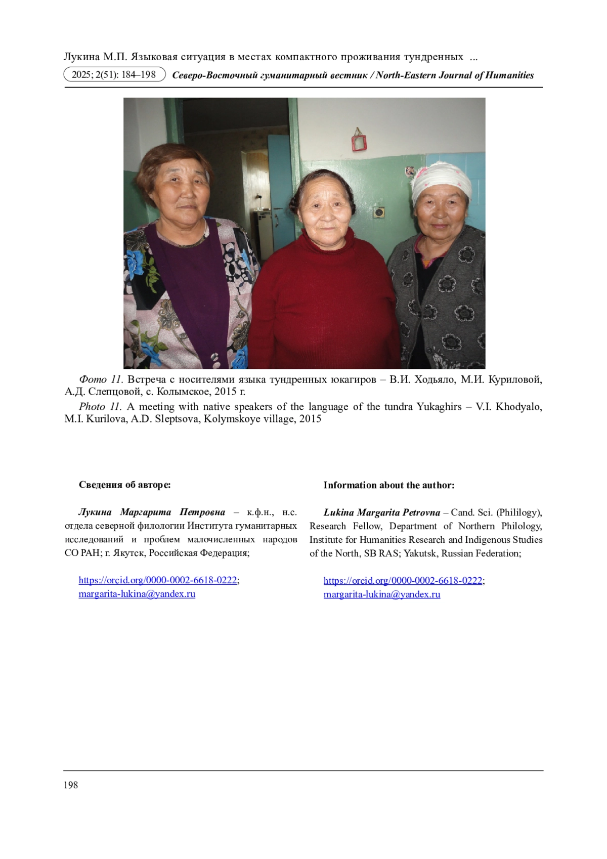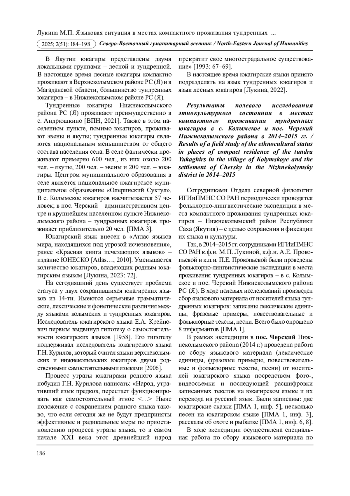 12. Лукина М.П. Роль первых словарей по юкагирскому языку в определении статуса юкагирских языков // Современное юкагироведение в контексте арктических исследований: мат-лы всерос. науч.-практ. конф., посвящ. 85-лет. Г.Н. Курилова - Улуро Адо (г. Якутск, 27-28 апреля 2023 г.) / редкол.: П.Е. Прокопьева (ответ. ред.), С.И. Шарина, Р.П. Кузьмина. Якутск: ИГИиПМНС СО РАН, 2023. С. 72. EDN: PSKCIT
