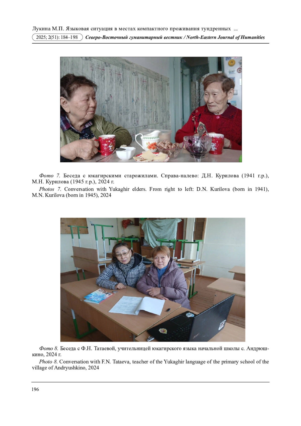 5. Захарова Н.Е., Захарова А.Е., Лукина М.П., Помогаева А.А. Материалы по языковой и этнокультурной ситуации в с. Андрюшкино Нижнеколымского района Республики Саха (Якутия) за 2023 год. Номер свидетельства о регистрации базы данных: RU 2024624304, дата публикации: 14.10.2024. EDN: UVMTPV