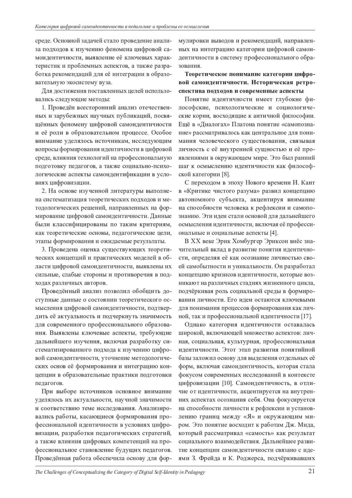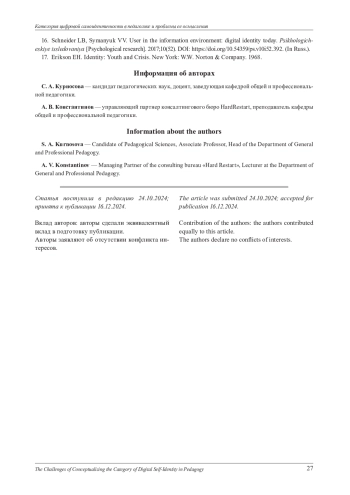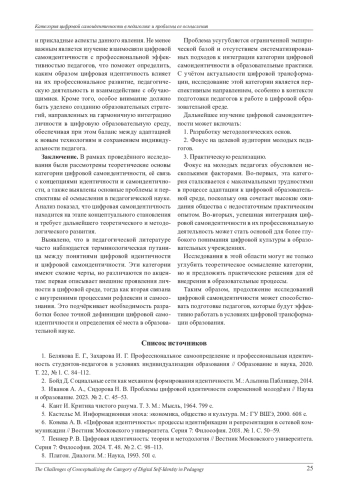В статье раскрывается сущность категории цифровой самоидентичности в контексте педагогической науки. Проведён анализ эволюции понятия идентичности, её трансформации под влиянием цифровизации, а также взаимосвязи цифровой самоидентичности с процессами профессиональной подготовки педагогов. Определены основные теоретические и методологические вызовы, связанные с осмыслением и практическим применением данной категории. Выявлены перспективы интеграции цифровой самоидентичности в образовательные программы и предложены направления для дальнейших исследований, направленных на адаптацию педагогической науки к вызовам цифровой трансформации образования. Статья подчёркивает необходимость создания комплексного подхода к изучению цифровой самоидентичности, её методологическому обоснованию и внедрению в практическую подготовку педагогических кадров.