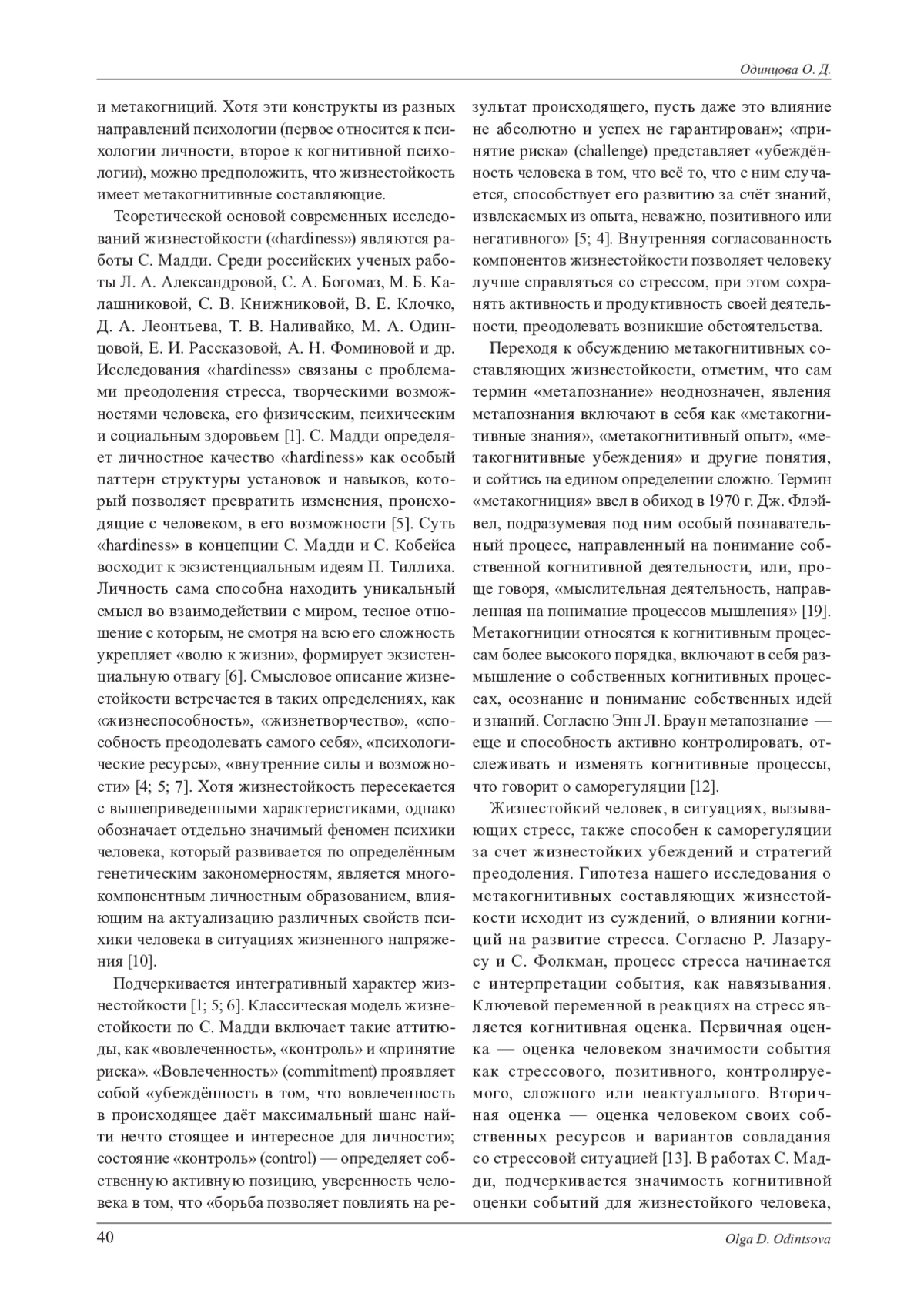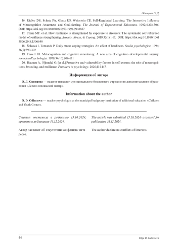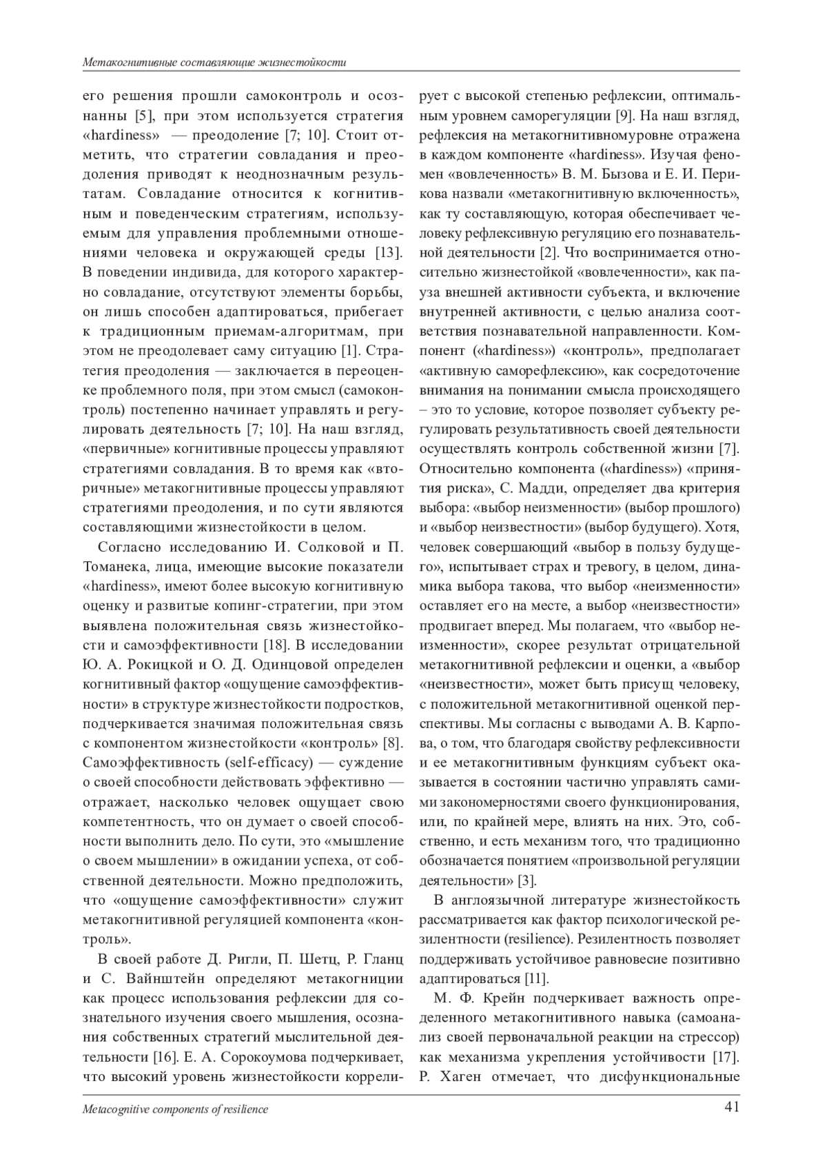 13. Lazarus R. S., Folkman S. Cognitive theories of stress and the issue of circularity // Dynamics of stress: Physiological, psychological and social perspectives. Boston, MA: Springer US, 1986. С. 63-80. Метакогнитивные составляющие жизнестойкости Metacognitive components of resilience 43.