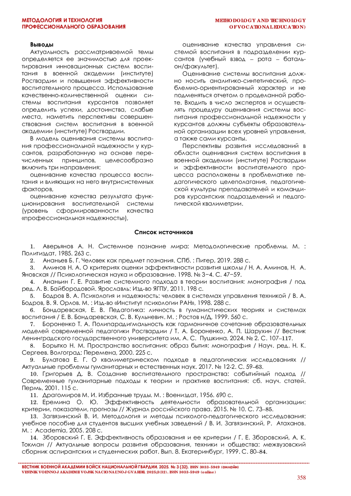 Utyuganov A. A. Sistema cennostno-smyslovyh orientacij kursantov vuzov nacional’noj gvardii: fenomenologiya i psihologo-pedagogicheskie determinanty formirovaniya. Kemerovo, 2019. 50 s. (In Russ.).