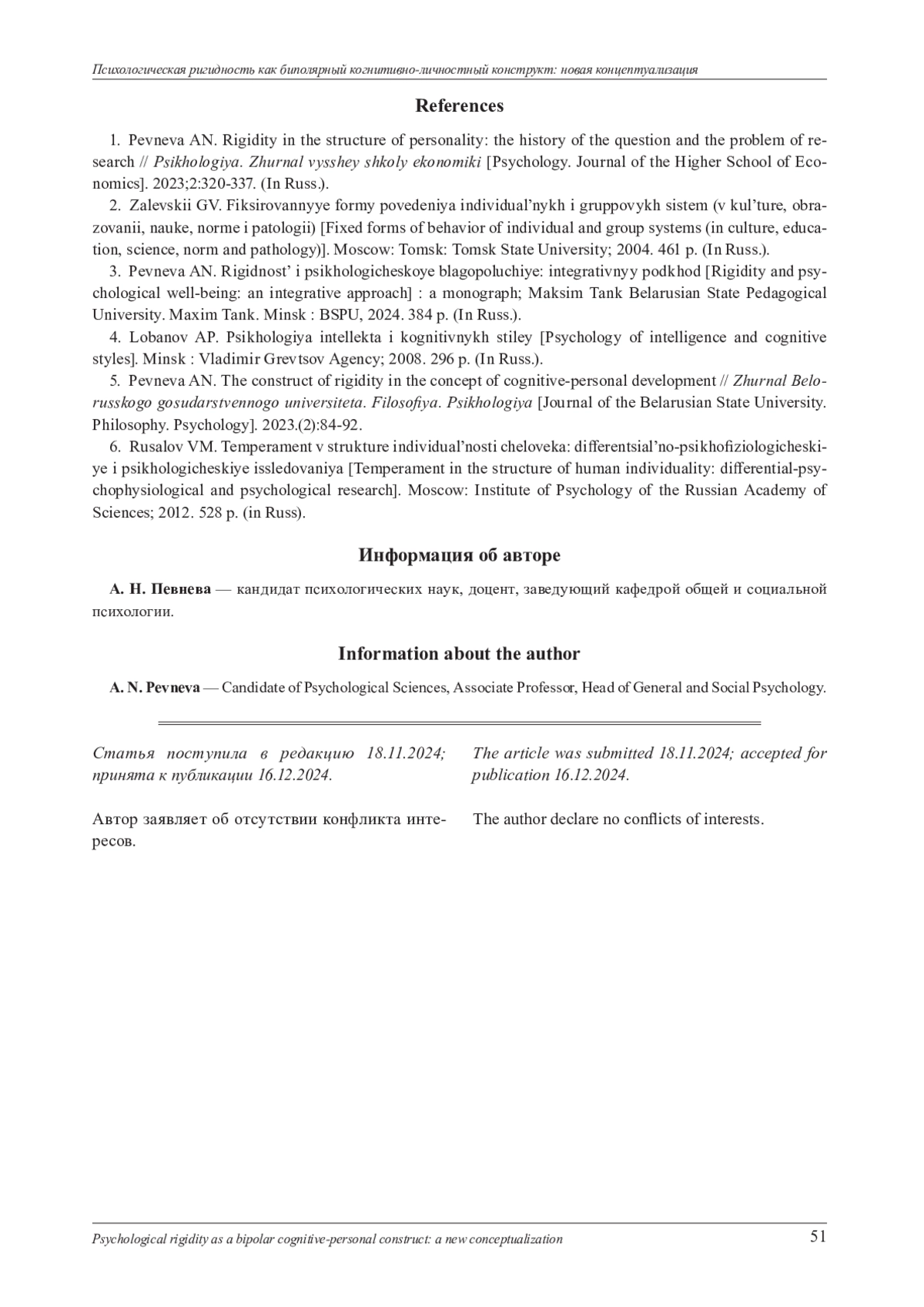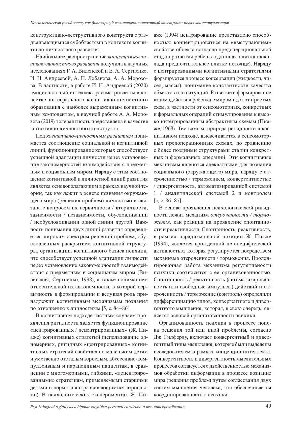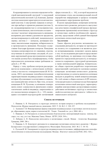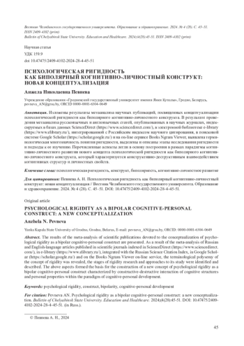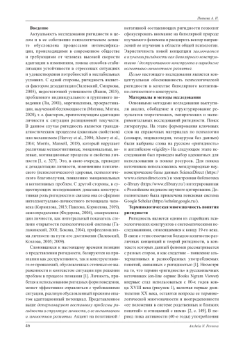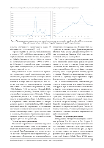 Изложены результаты метаанализа научных публикаций, посвященных концептуализации психологической ригидности как биполярного когнитивно-личностного конструкта. В результате проведения метаанализа русскоязычных и англоязычных статей, опубликованных в научных журналах, индексируемых в базах данных ScienceDirect (https://www. sciencedirect. com/), в электронной библиотеке e-library (https://www. elibrary. ru/), интегрированной с Российским индексом научного цитирования, в поисковой системе Google Scholar (https://scholar. google. ru/) и на on-line сервисе Books Ngram Viewer, выявлена терминологическая многозначность понятия ригидности, выделены и описаны этапы исследования ригидности и подходы к ее изучению. Перечисленные аспекты легли в основу построения в рамках парадигмы когни-тивно-личностного развития нового концепта психологической ригидности как биполярного когнитивно-личностного конструкта, который характеризуется конструктивно-деструктивным взаимодействием когнитивных структур и личностных свойств.