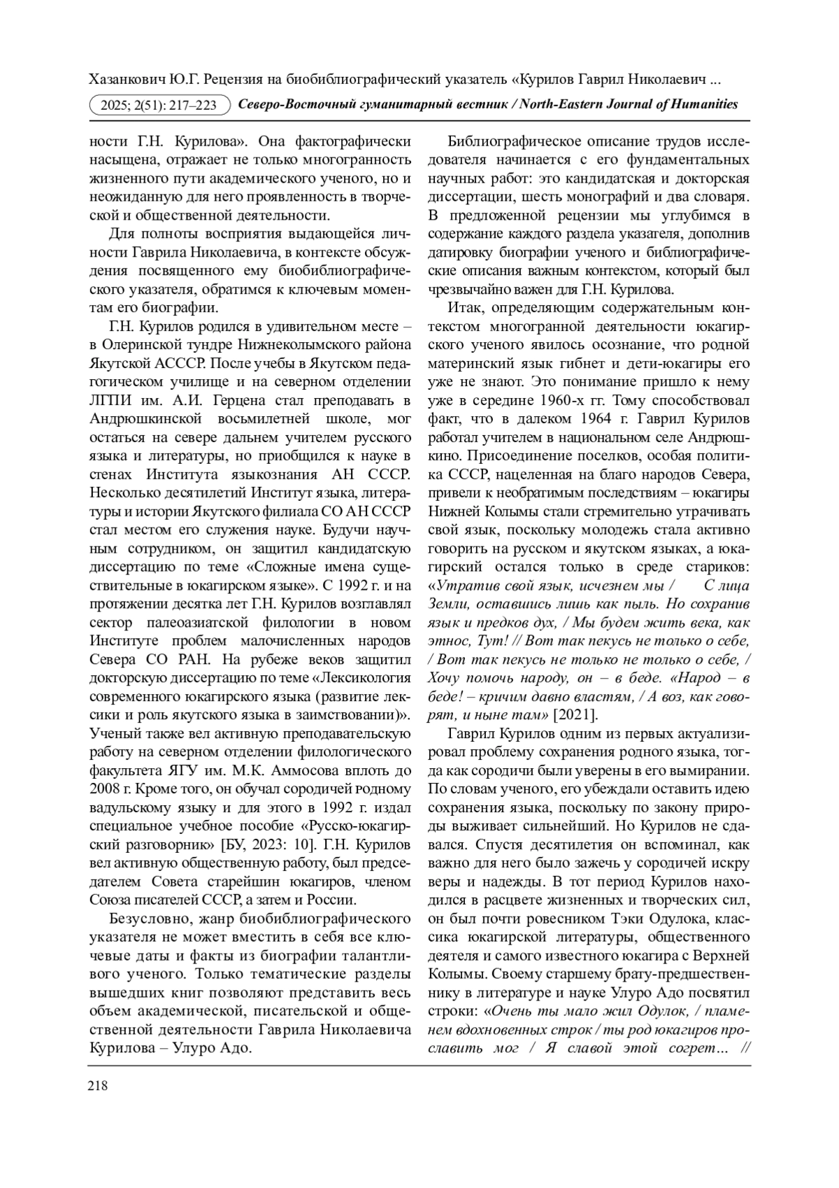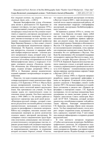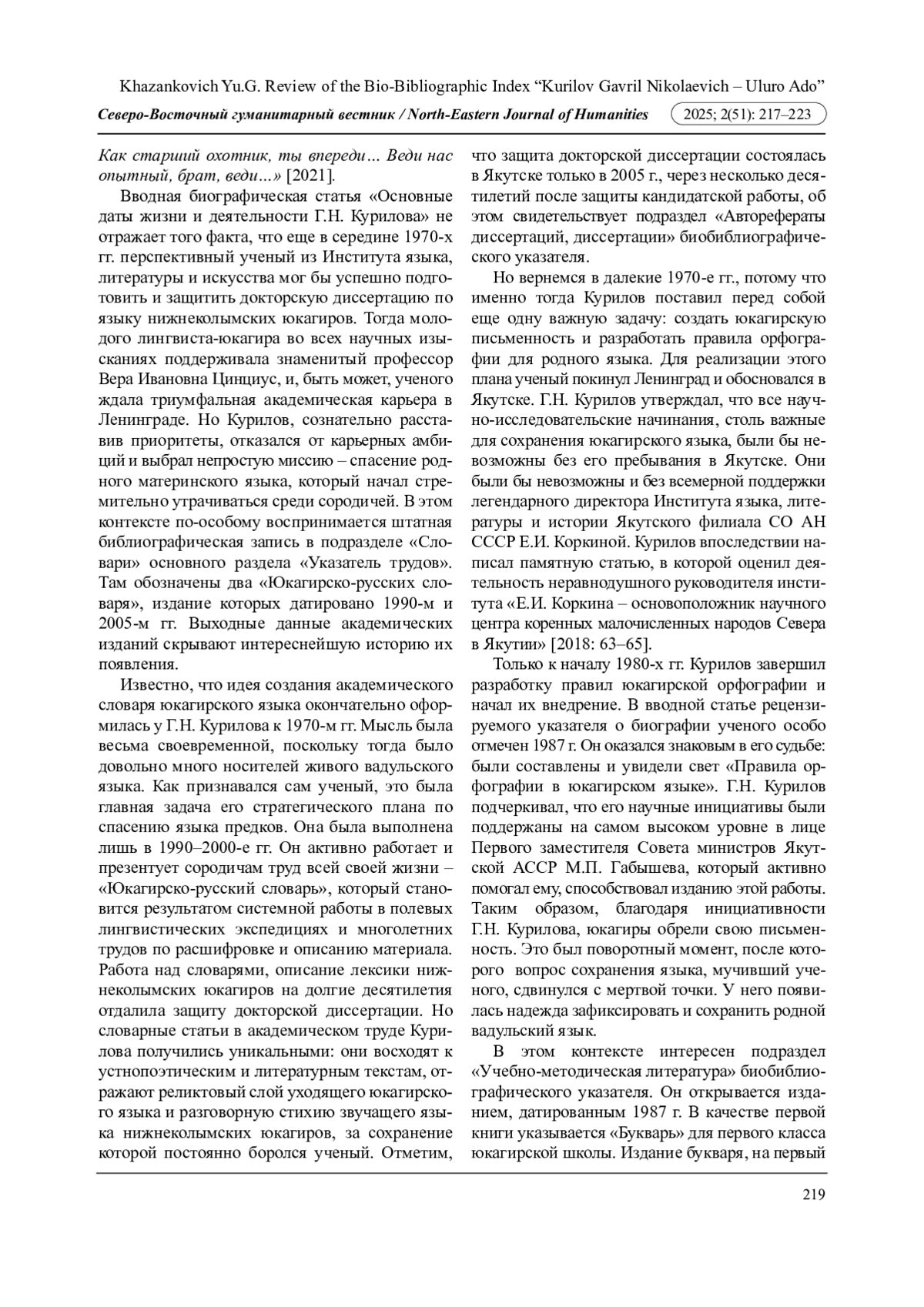Данный обзор биобиблиографического указателя «Курилов Гаврил Николаевич - Улуро Адо», содержание которого будет постоянно полезным кругом исследований и педагогов, начинающих молодых ученых и студентов, не только как вспомогательное издание, но и как показательный пример самоотверженного исследования науки, активности сообщества и неравнодушия к тому же, «что не есть ты сам».
