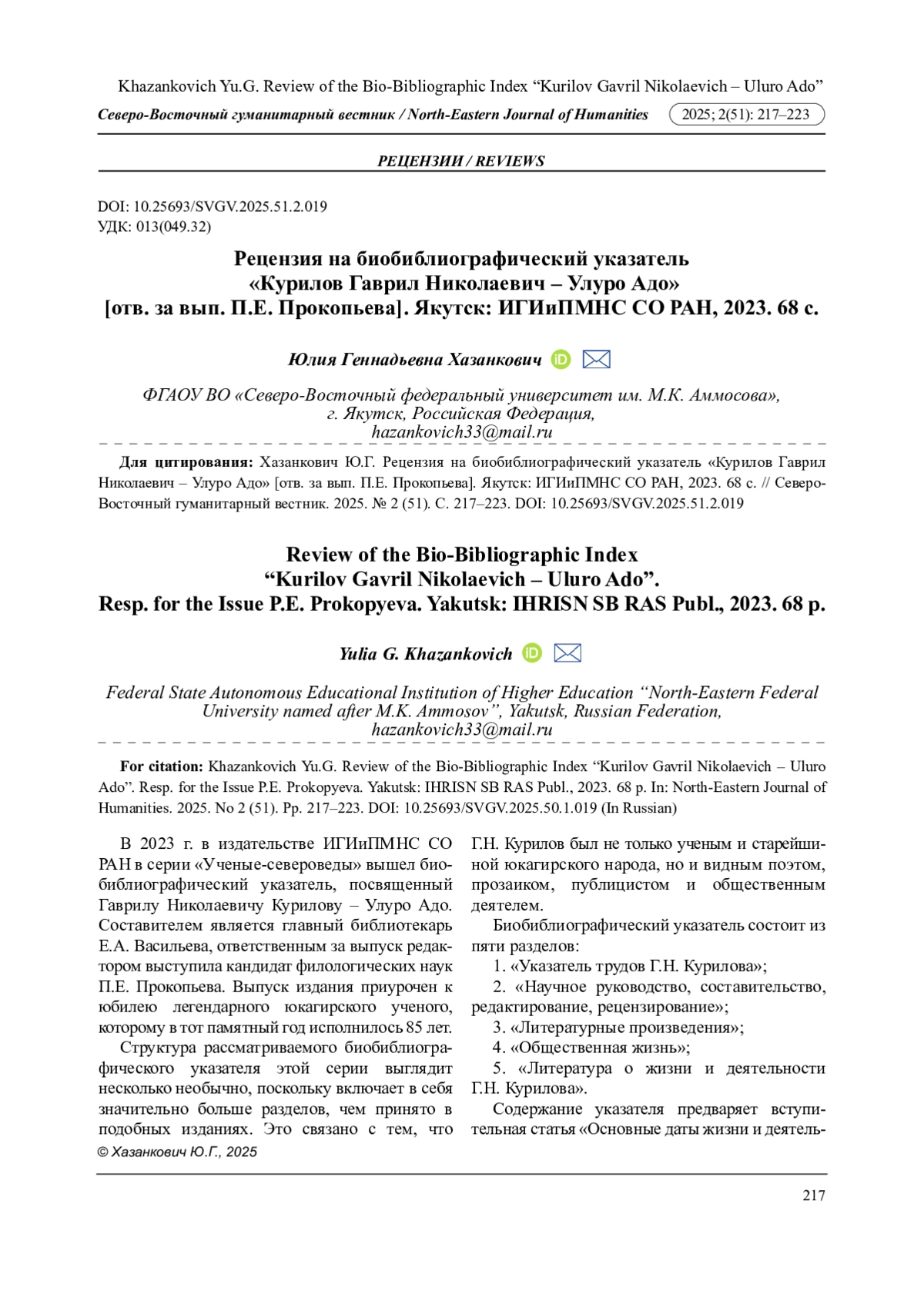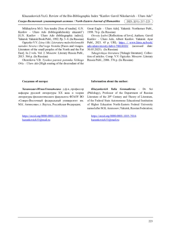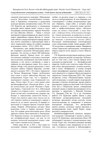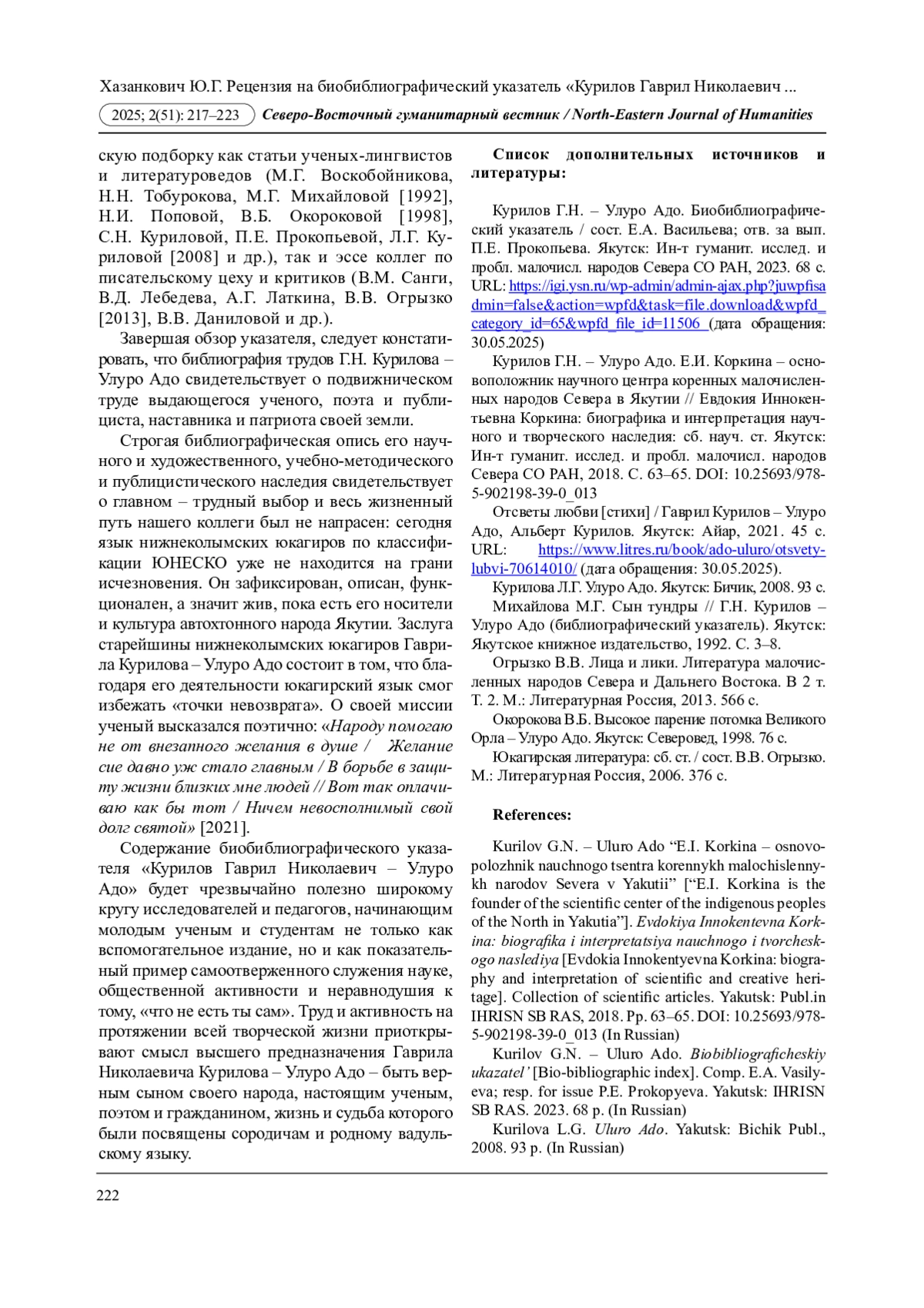 1. Курилов Г.Н. - Улуро Адо. Биобиблиографический указатель / сост. Е.А. Васильева; отв. за вып. П.Е. Прокопьева. Якутск: Ин-т гуманит. исслед. и пробл. малочисл. народов Севера СО РАН, 2023. 68 с. URL: https://igi.ysn.ru/wp-admin/admin-ajax.php?juwpfisadmin=false&action=wpfd&task=file.download&wpfd_category_id=65&wpfd_file_id=11506 (дата обращения: 30.05.2025).