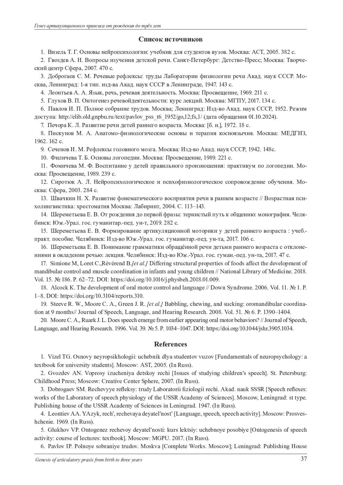 19. Steeve R. W., Moore C. A., Green J. R. [et al.] Babbling, chewing, and sucking: oromandibular coordination at 9 months// Journal of Speech, Language, and Hearing Research. 2008. Vol. 51. № 6. P. 1390-1404.