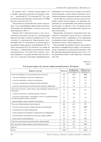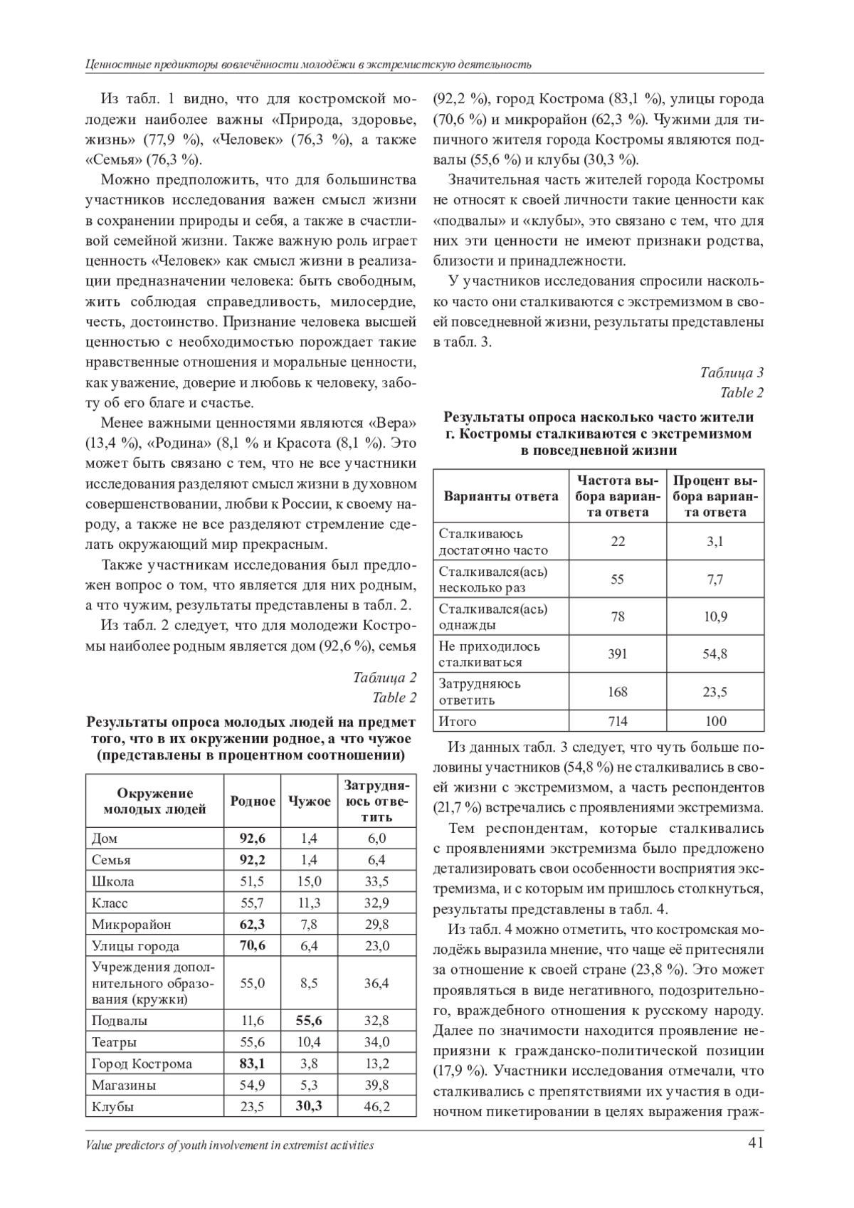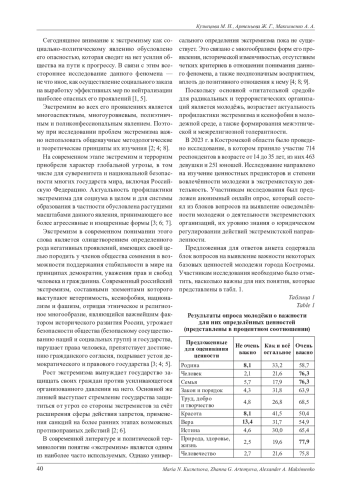 Данная статья посвящена рассмотрению ценностных предикторов вовлечённости людей молодого возраста в экстремистскую деятельность (на примере исследования молодёжи города Костромы). Опасность современного экстремизма заключается, в том числе, во вовлечении молодых людей в экстремистскую деятельность, в негативном влиянии на их личность, формировании нравственной и мировоззренчески деградированной личности. В статье представлены результаты степени подверженности экстремистской индоктринированности молодёжи города Костромы и уровня вовлечённости её в деятельность экстремистских организаций.
