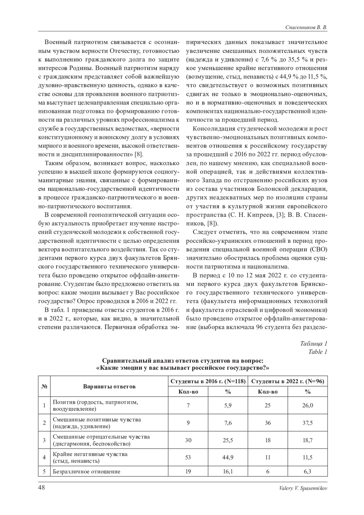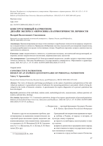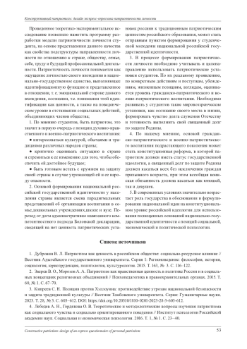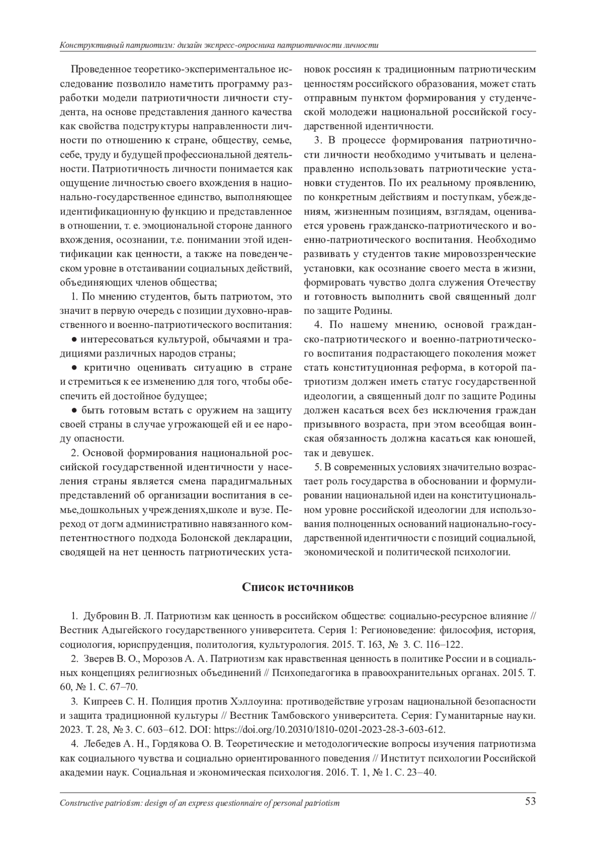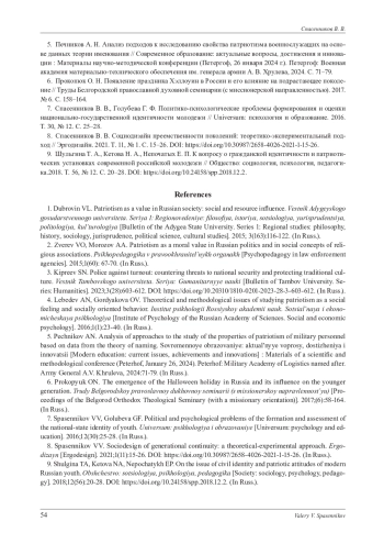 4. Лебедев А. Н., Гордякова О. В. Теоретические и методологические вопросы изучения патриотизма как социального чувства и социально ориентированного поведения // Институт психологии Российской академии наук. Социальная и экономическая психология. 2016. Т. 1, № 1. С. 23-40. Спасенников В. В. Valery V. Spasennikov 54. EDN: WDXXPX