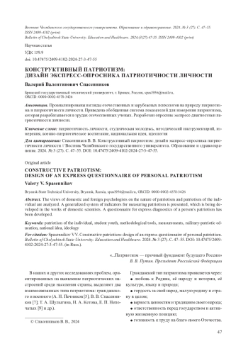 Проанализированы взгляды отечественных и зарубежных психологов на природу патриотизма и патриотичности личности. Приведена обобщенная система показателей для измерения патриотизма, которая разрабатывается в трудах отечественных ученых. Разработан опросник экспресс-диагностики патриотичности личности.