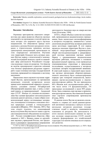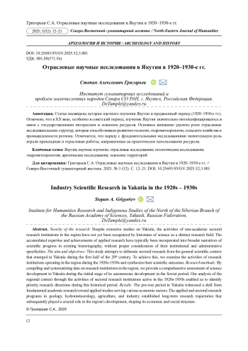 Статья посвящена истории научного изучения Якутии в предвоенный период (1920-1930-е гг.). Отмечено, что в ХХ веке, особенно в советский период, изучение Якутии значительно интенсифицировалось в связи с государственными интересами в освоении ресурсов. Основное внимание уделено роли отраслевых исследовательских структур, которые способствовали развитию геологии, гидрометеорологии, сельского хозяйства и промышленности региона. Отмечается, что наряду с фундаментальными исследованиями значительную роль играли прикладные и отраслевые работы, направленные на практическое использование ресурсов.