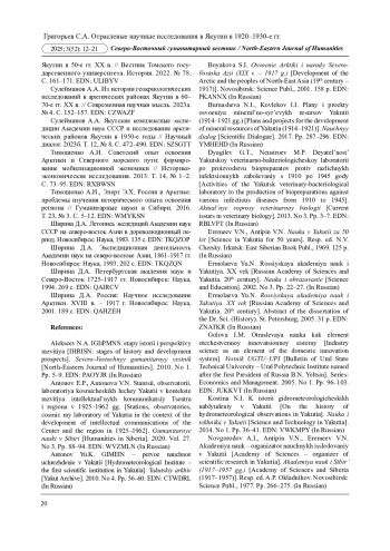 20. Тимошенко А.И., Элерт Э.Х. Россия в Арктике: проблемы изучения исторического опыта освоения региона // Гуманитарные науки в Сибири. 2016. Т. 23, № 3. С. 5-12. EDN: WMYKSN