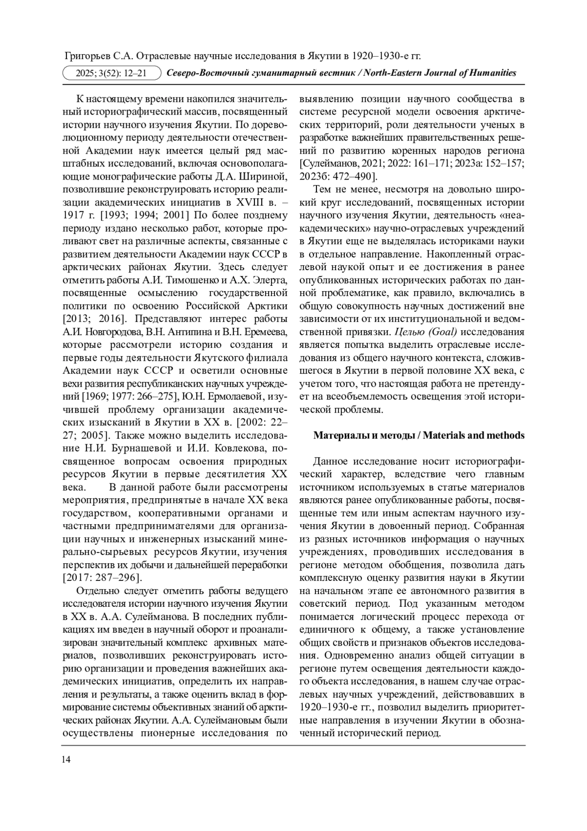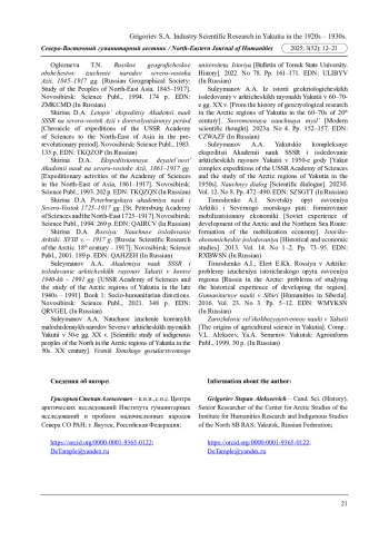 16. Сулейманов А.А. Научное изучение коренных малочисленных народов Севера в арктических районах Якутии в 50-е гг. ХХ в. // Вестник Томского государственного университета. История. 2022. № 78. С. 161-171. EDN: ULIBYV