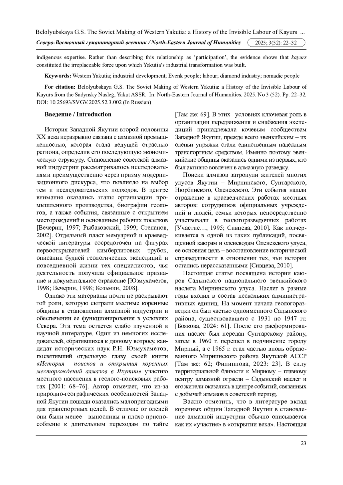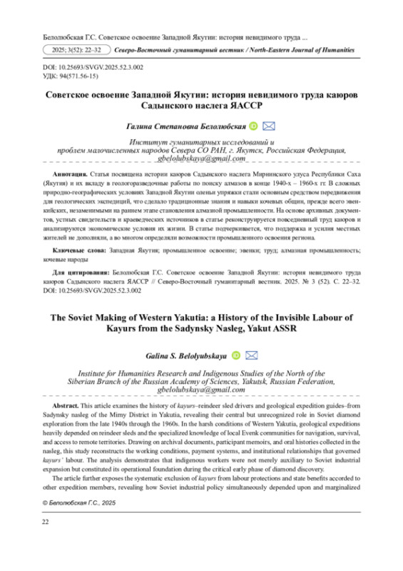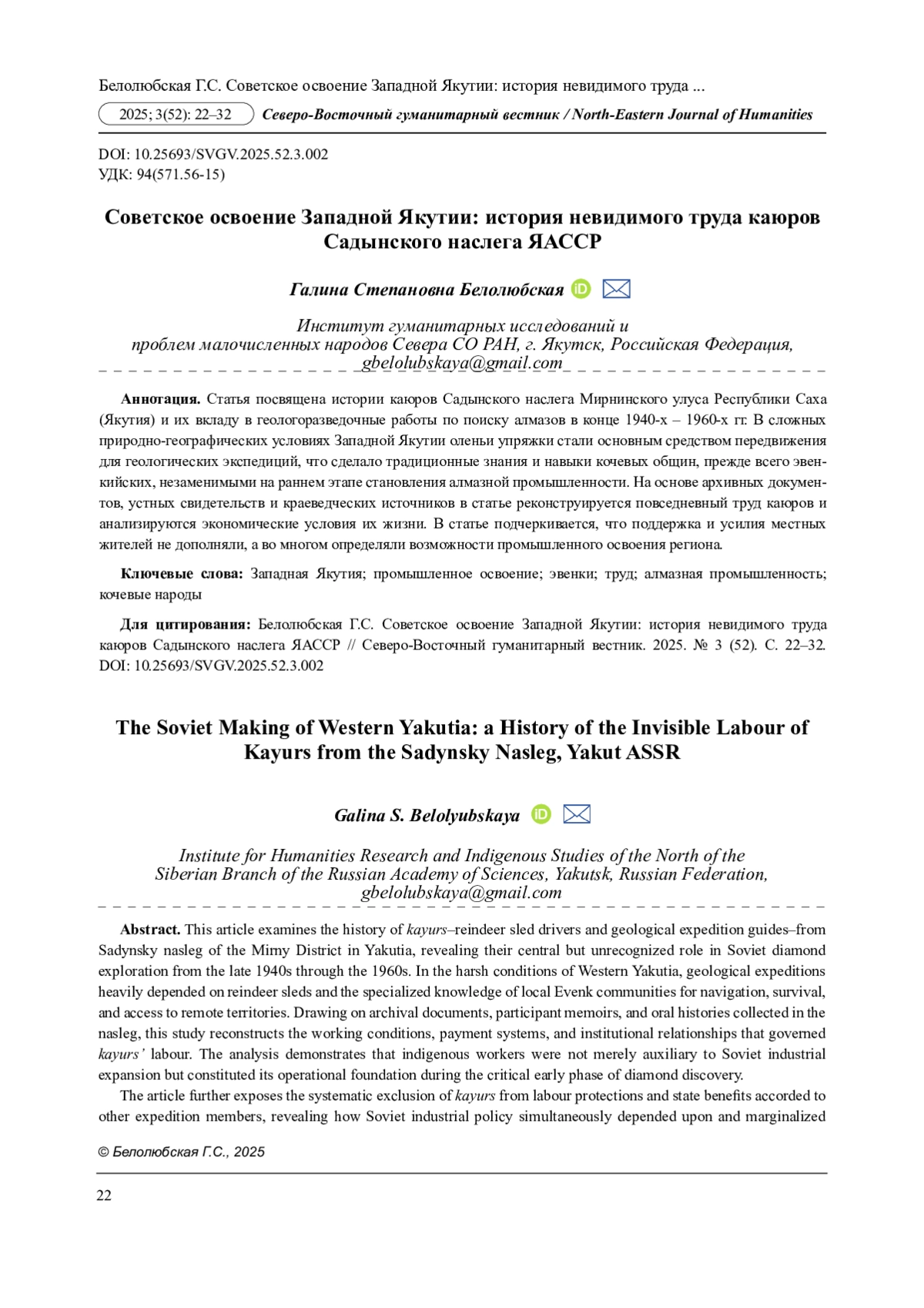 Статья посвящена истории каюров Садынского наслега Мирнинского улуса Республики Саха (Якутия) и их вкладу в геологоразведочные работы по поиску алмазов в конце 1940-х - 1960-х гг. В сложных природно-географических условиях Западной Якутии оленьи упряжки стали основным средством передвижения для геологических экспедиций, что сделало традиционные знания и навыки кочевых общин, прежде всего эвенкийских, незаменимыми на раннем этапе становления алмазной промышленности. На основе архивных документов, устных свидетельств и краеведческих источников в статье реконструируется повседневный труд каюров и анализируются экономические условия их жизни. В статье подчеркивается, что поддержка и усилия местных жителей не дополняли, а во многом определяли возможности промышленного освоения региона.