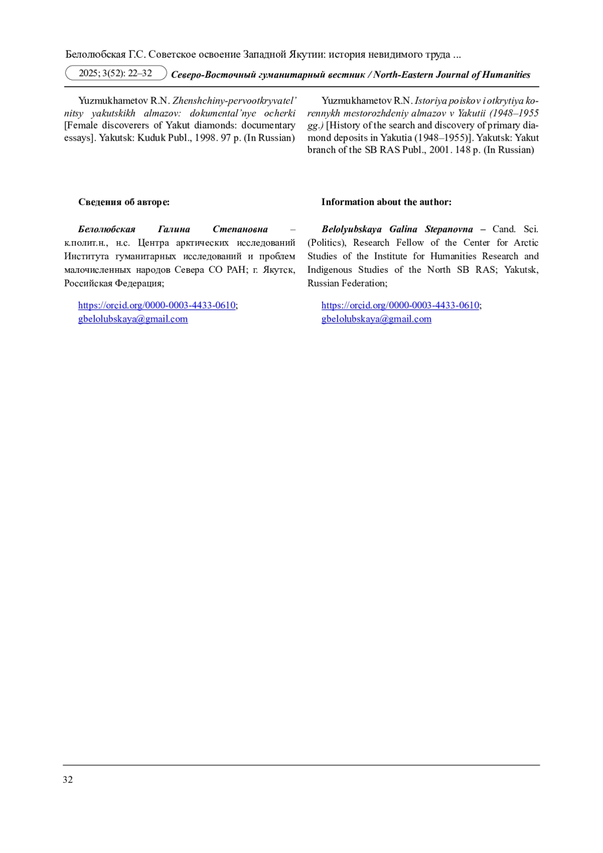 18. Юзмухаметов Р.Н. Женщины-первооткрывательницы якутских алмазов: документальные очерки. Якутск: Кудук, 1998. 97 с.
