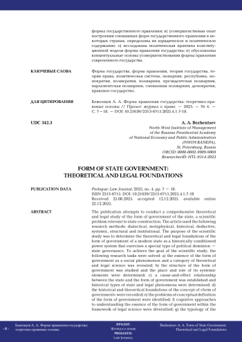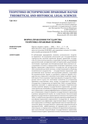 В публикации предпринята попытка комплексного теоретико-правового исследования актуальной для государственного строительства научной проблемы формы правления государства. В статье использовались следующие методы исследования: диалектический, метафизический, исторический, дедуктивный, системный, структурно-институциональный. Цель научного исследования состояла в определении теоретико-правовых основ формы правления современного государства как исторически обусловленной властной системы, осуществляющей особый вид политического владычества – государственное правление. Для достижения цели научного исследования решены следующие исследовательские задачи: а) раскрыта сущность формы государства как социального явления и категории теоретико-правовой науки; б) исследована структура формы государства и определено место и роль его системных элементов; в) установлена причинно-следственная связь между государством и формой государства и определены исторические типы государственноправовых явлений; г) зафиксированы историко-теоретические основы понятия «форма государственного правления»; д) выявлены проблемы понятийного определения формы государственного правления; е) диверсифицированы познавательные подходы к пониманию сущности формы государственного правления в рамках юридической науки; ж) осуществлена типологизация формы государственного правления и уточнены ее исторические типы; з) закреплены признаки и сформулирована дефиниция типов формы правления современного государства; и) представлена видовая классификация современных форм государственного правления; к) обобщен зарубежный опыт построения классических форм государственного правления (парламентской и президентской), зафиксированы их юридические и политические модели; л) определены особенности практической реализации классических моделей форм государственного правления; м) выяснены историко-правовые основы становления смешанной формы государственного правления; н) усовершенствован опыт построения смешанных форм государственного правления в некоторых странах, определены их юридическое и политическое содержание; о) исследована политическая практика конституционной модели формы правления государства; п) обусловлены концептуальные основы усовершенствования формы правления современного государства.