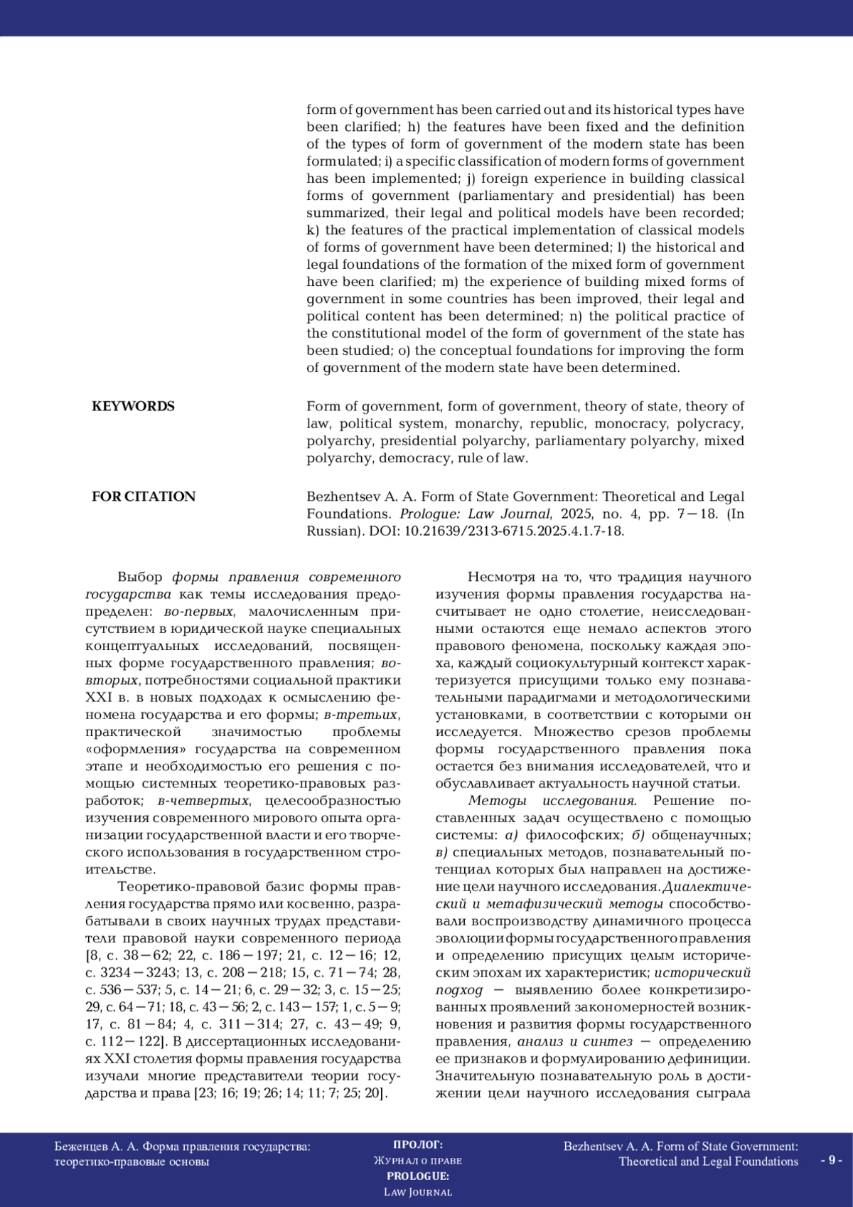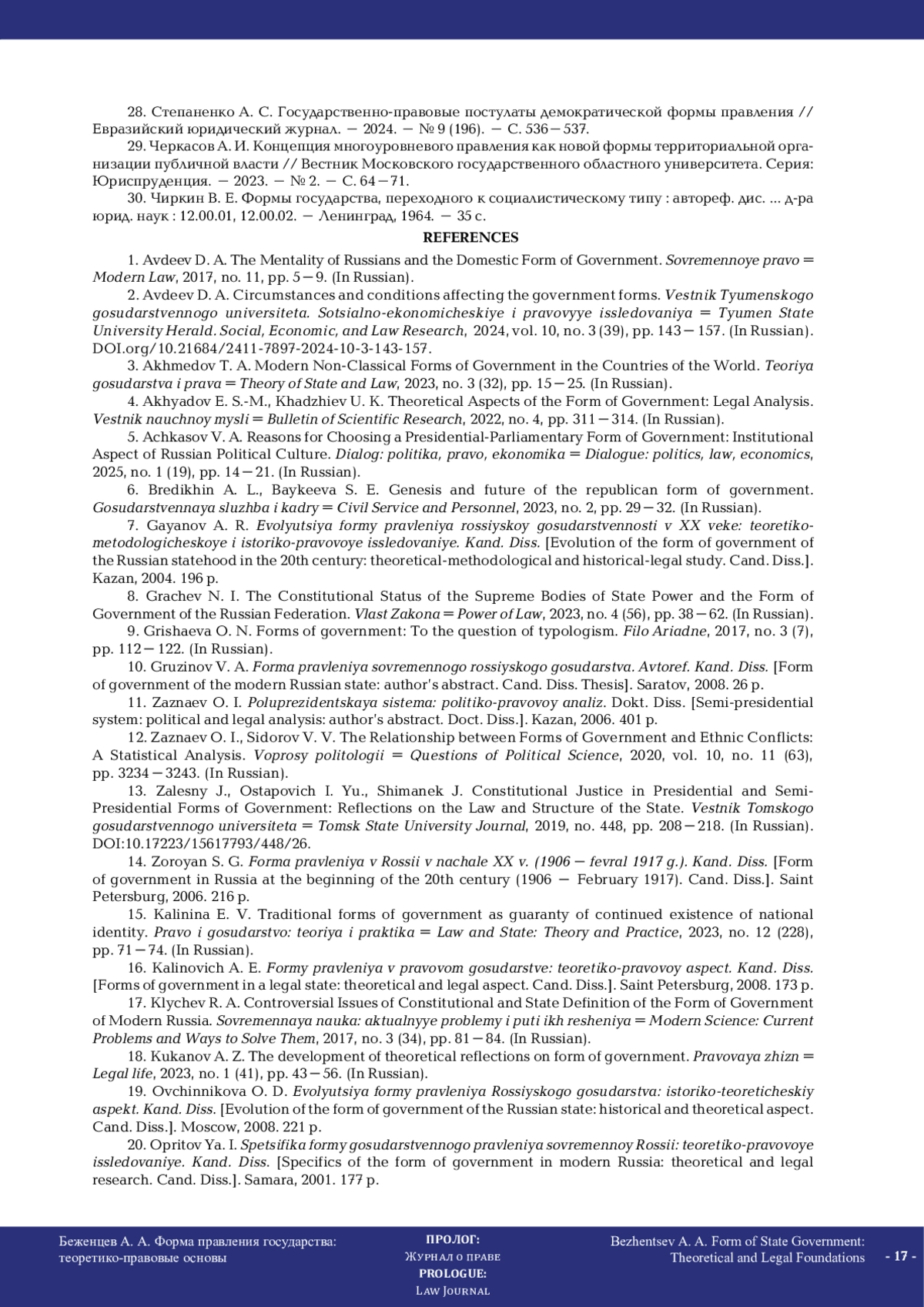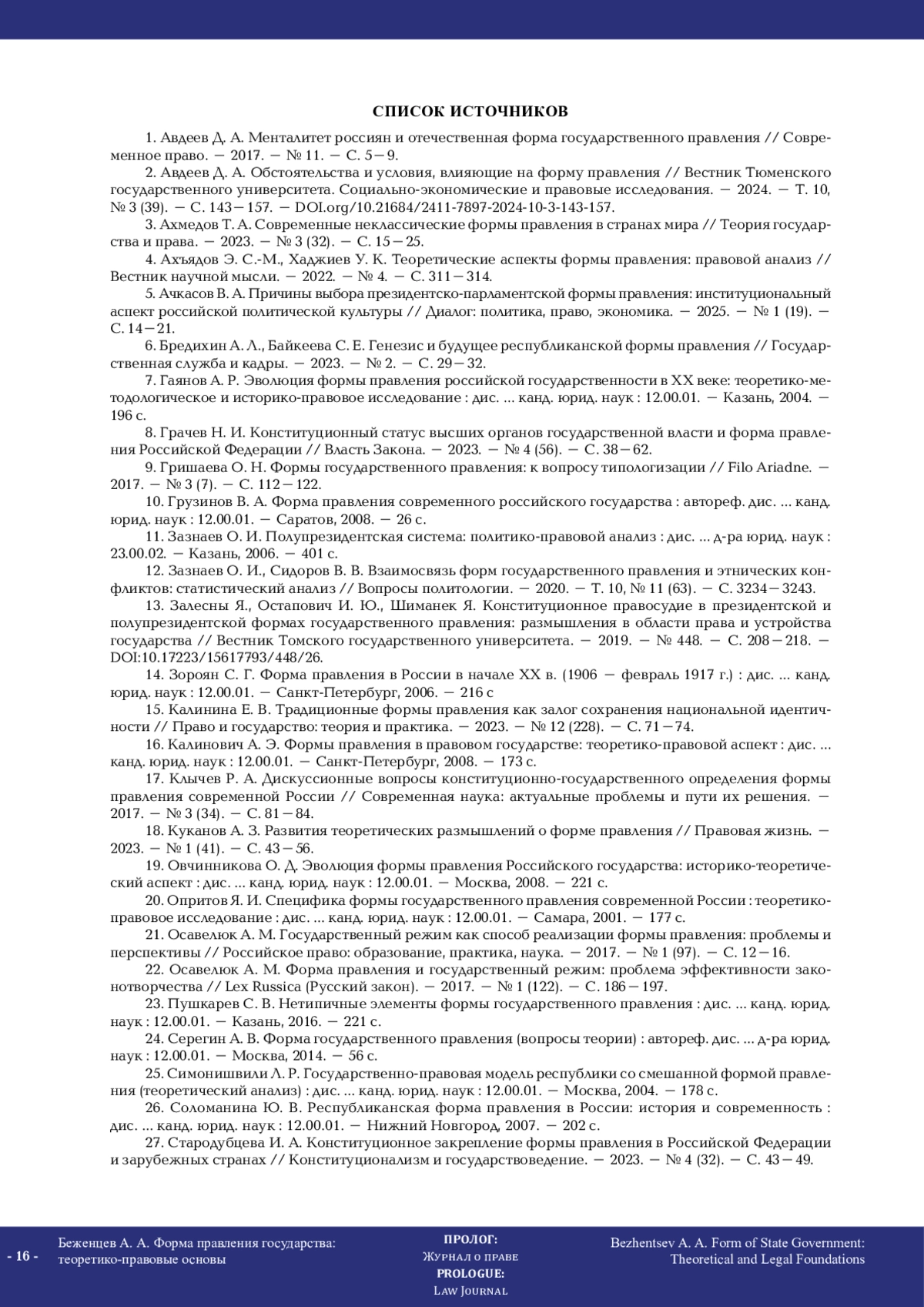 2. Авдеев Д. А. Обстоятельства и условия, влияющие на форму правления // Вестник Тюменского государственного университета. Социально-экономические и правовые исследования. - 2024. - Т. 10, № 3 (39). - С. 143-157. - DOI.org/10.21684/2411-7897-2024-10-3-143-157.