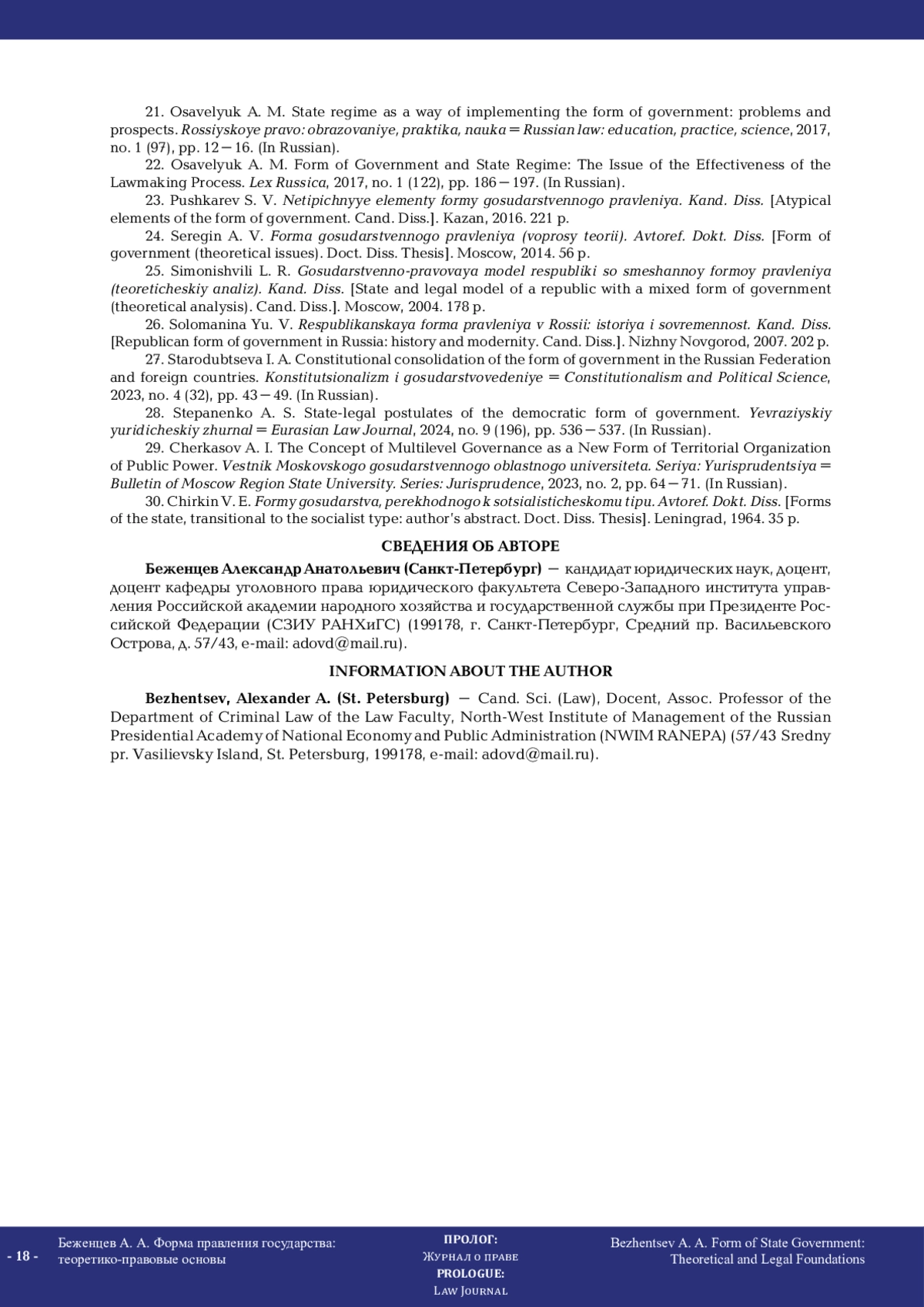 18. Куканов А. З. Развития теоретических размышлений о форме правления // Правовая жизнь. - 2023. - № 1 (41). - С. 43-56.