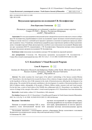 В статье рассматривается визуальный аспект авторской методологии известного ученого-сибиреведа Г. В. Ксенофонтова, разрабатывавшего в своих исследованиях теорию эволюции степной кочевой культуры в Сибири на основе гипотезы о ключевой роли народного орнамента в изучении исторических процессов, влияющих на развитие этноса. Ученый внес личный вклад в разработку ряда теоретических проблем в области религиоведения, этнографии народов Сибири, фольклористики, музейного дела и визуальных исследований. Впервые выявлен круг художников ЯАССР, сотрудничавших с Г. В. Ксенофонтовым. Определены векторы смены концепций авторских визуальных программ исследования Г. В. Ксенофонтова.