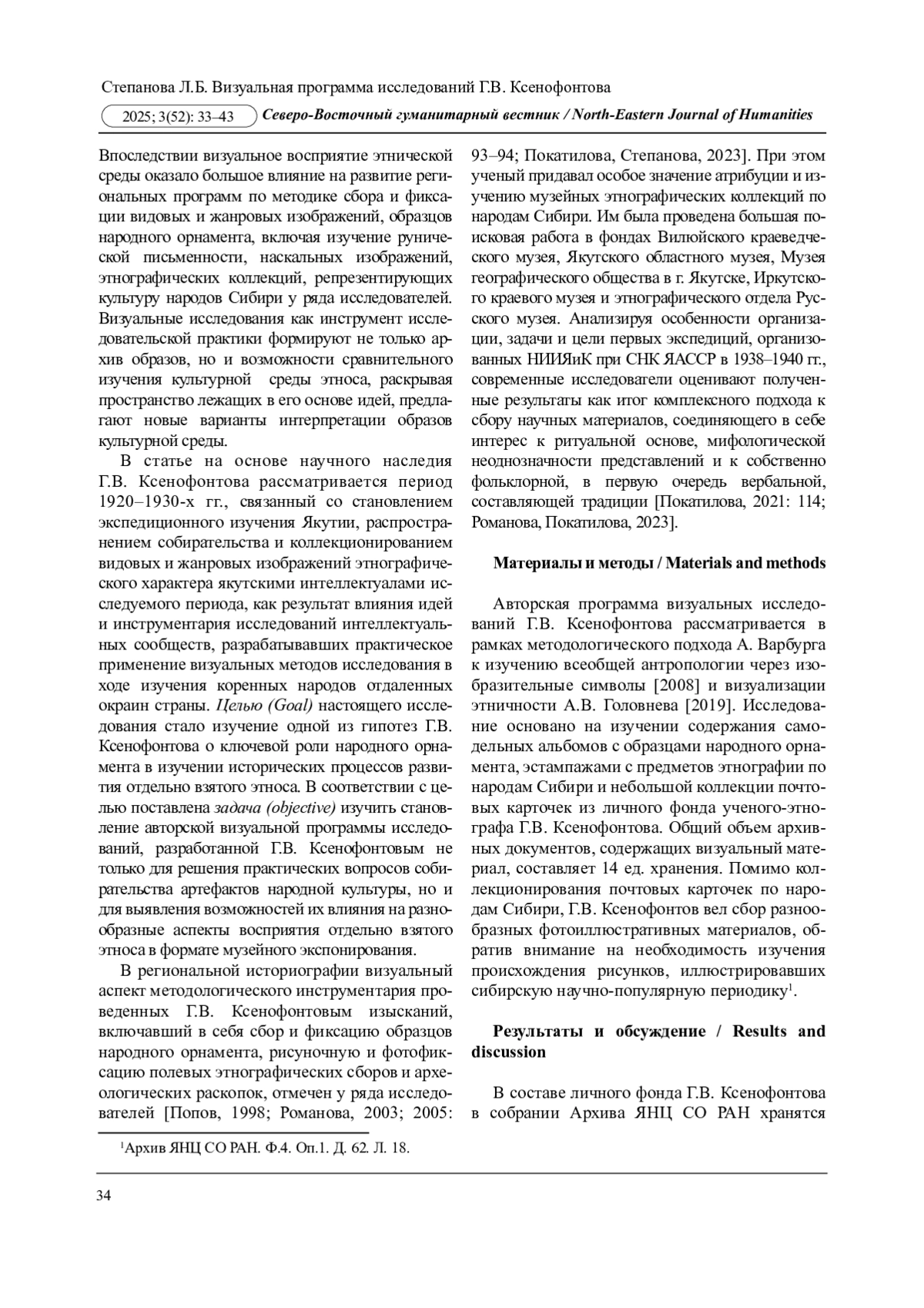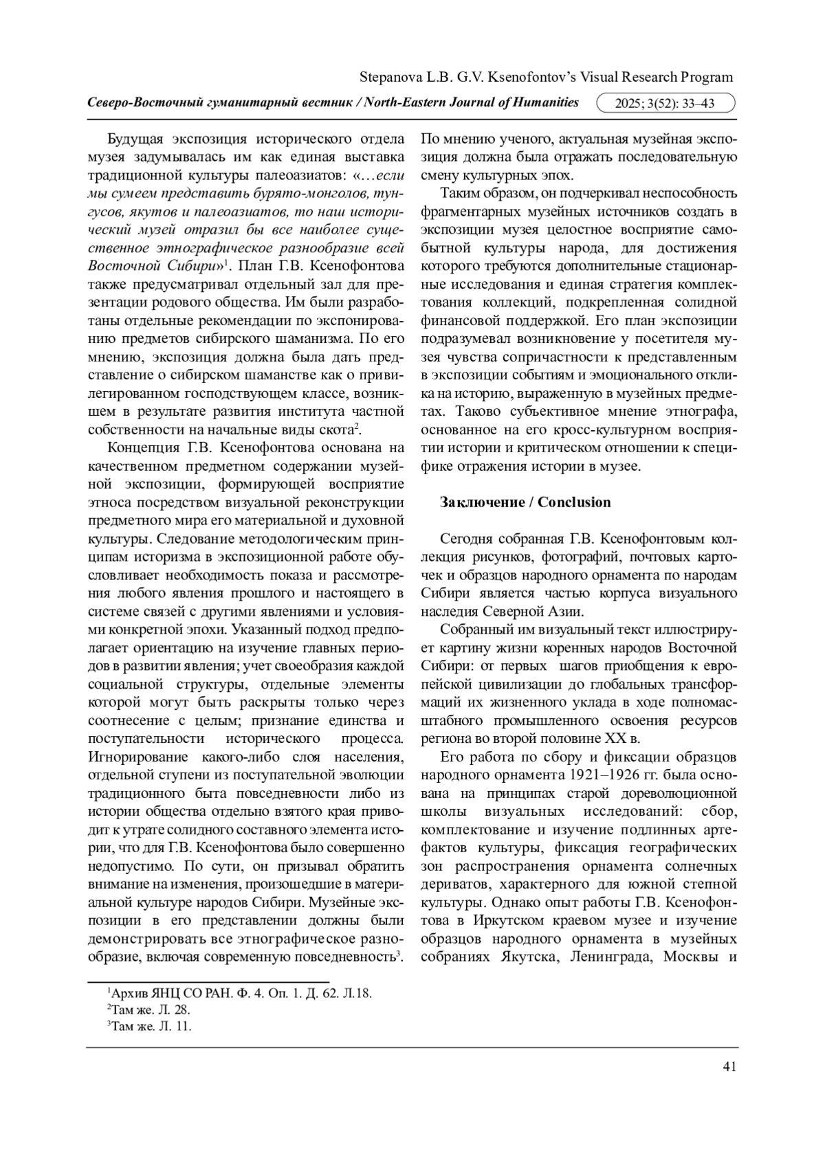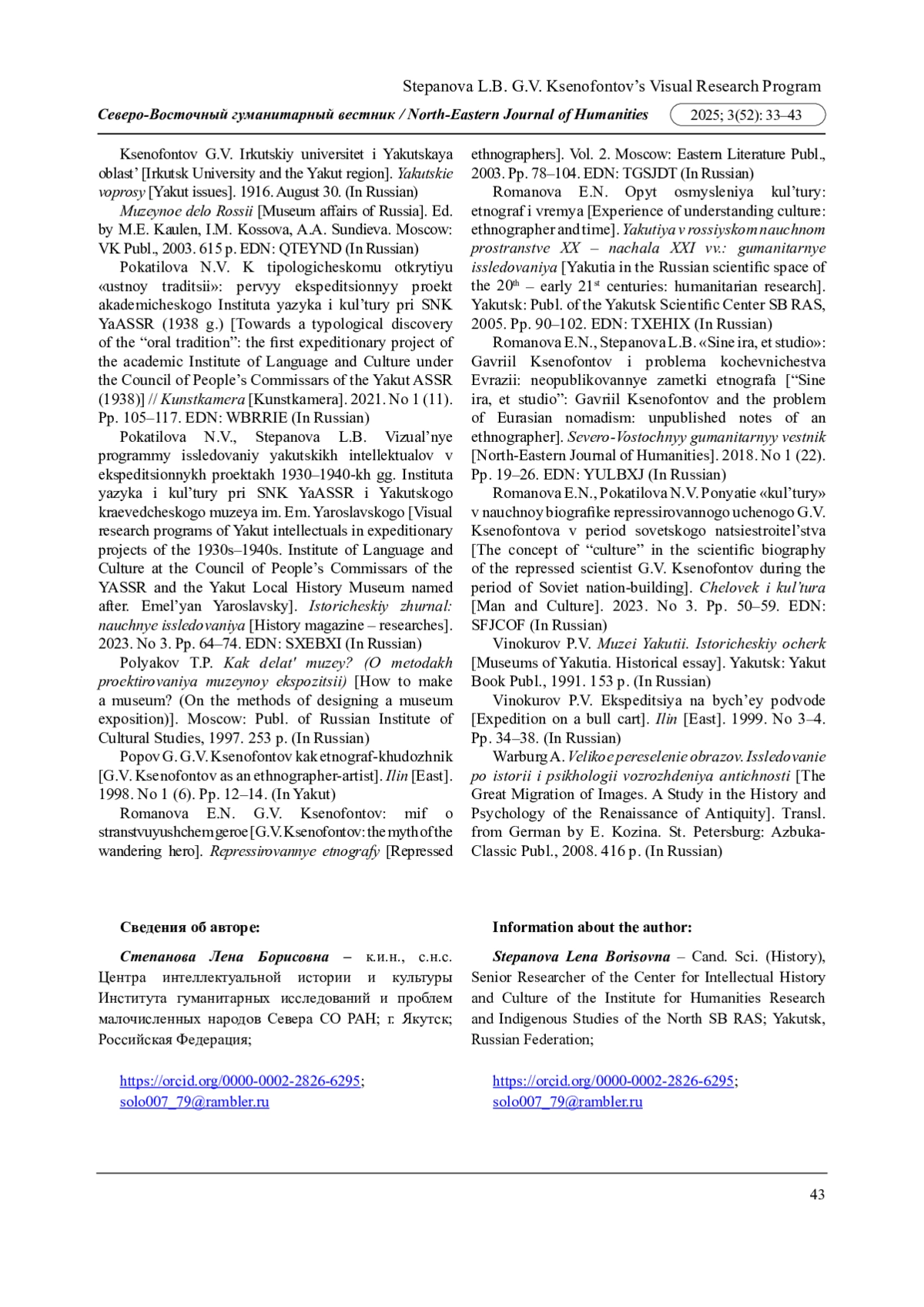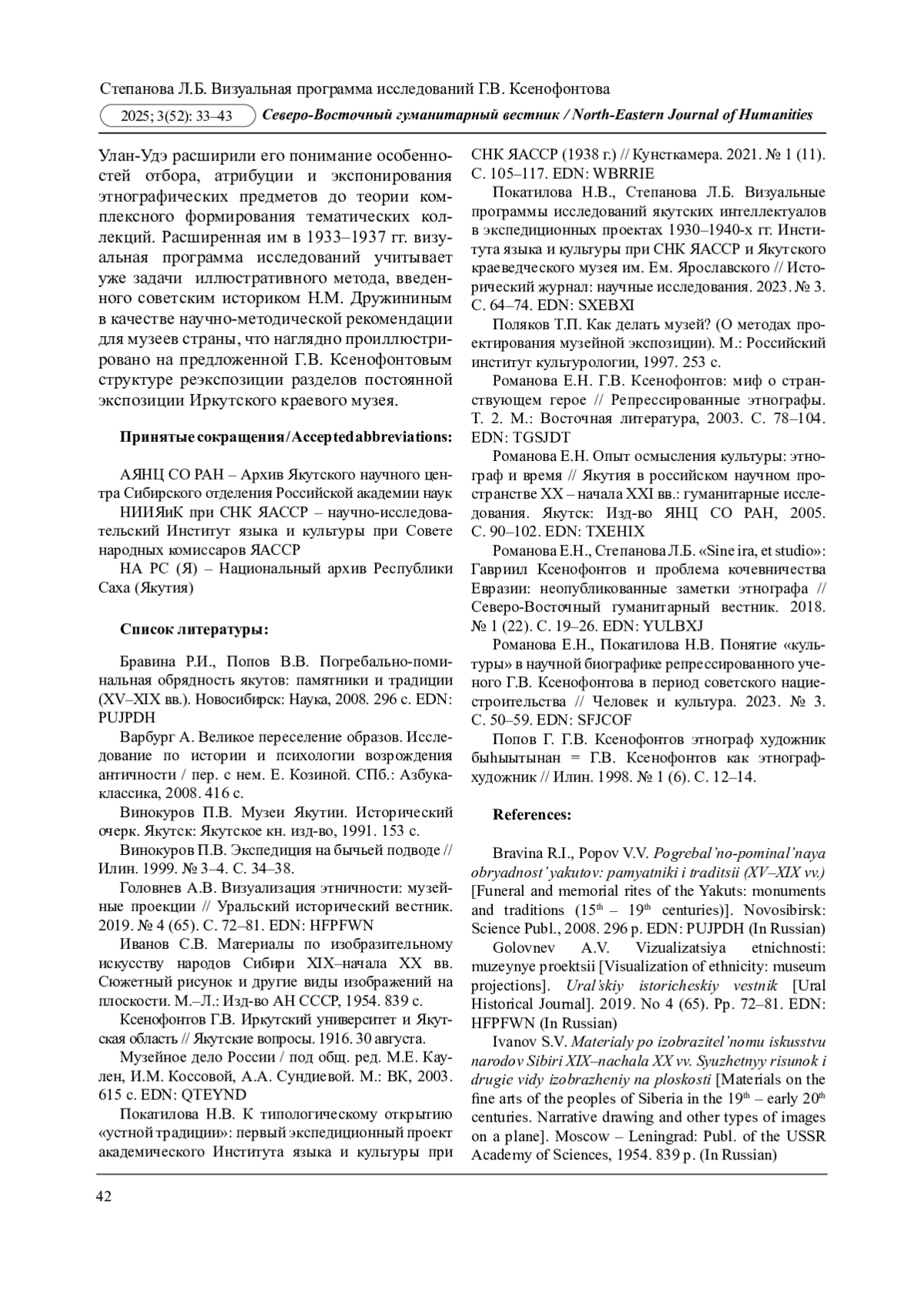 14. Романова Е.Н., Степанова Л.Б. “Sine ira, et studio”: Гавриил Ксенофонтов и проблема кочевничества Евразии: неопубликованные заметки этнографа // Северо-Восточный гуманитарный вестник. 2018. № 1 (22). С. 19-26. EDN: YULBXJ