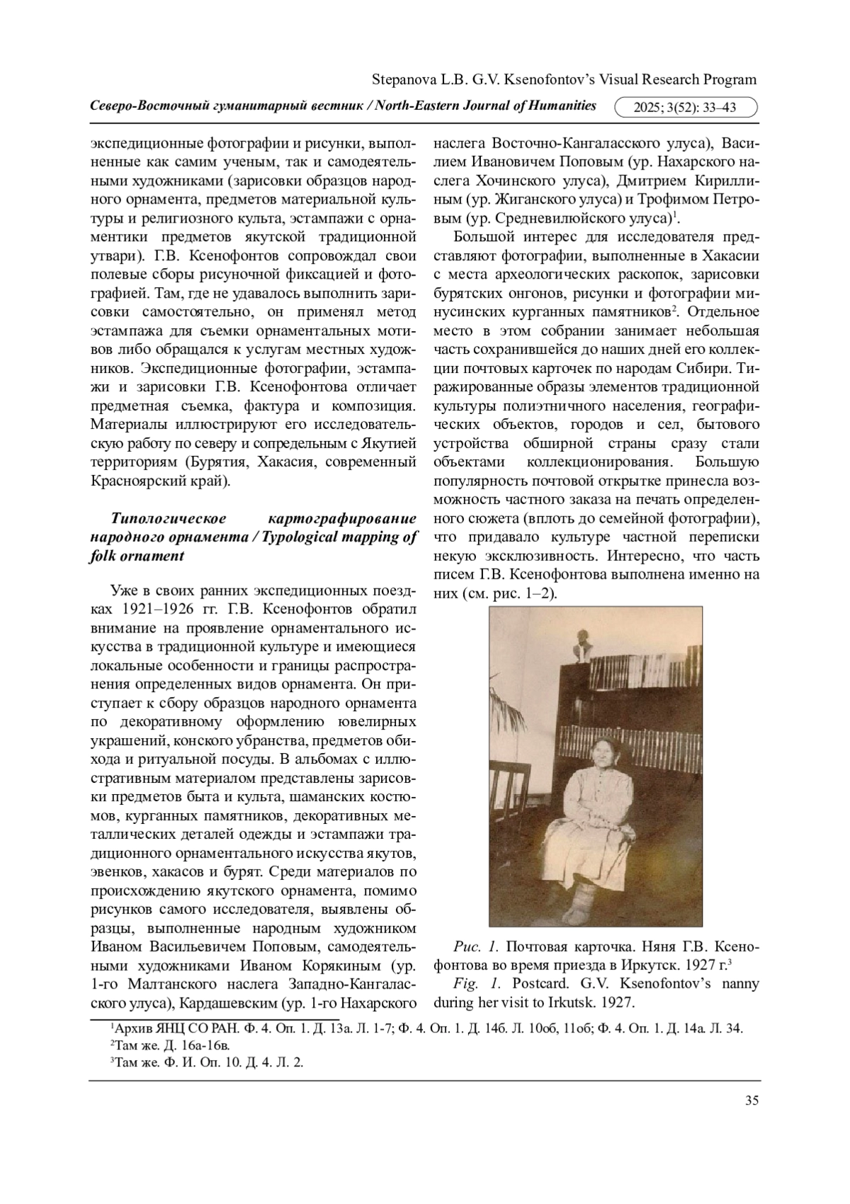 10. Покатилова Н.В., Степанова Л.Б. Визуальные программы исследований якутских интеллектуалов в экспедиционных проектах 1930-1940-х гг. Института языка и культуры при СНК ЯАССР и Якутского краеведческого музея им. Ем. Ярославского // Исторический журнал: научные исследования. 2023. № 3. С. 64-74. EDN: SXEBXI